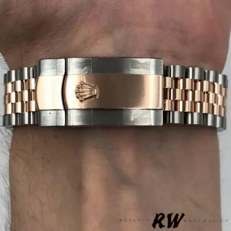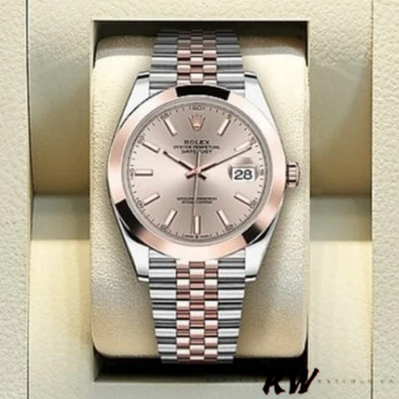 Rolex Datejust 126301 Rose Gold Sundust Index Dial 41MM Mens Replica Watch,41mm Everose Rolesor case with steel monobloc middle case, screw-down steel back, Everose Gold screw-down crown, Everose Gold smooth bezel, scratch-resistant double anti-reflective sapphire crystal with cyclops lens over the date, Sundust dial with index hour markers. Date at 3 o’clock that changes instantaneously at midnight in a few thousandths of a second, Everose Rolesor Jubilee bracelet made from a combination of steel and Everose Gold with five-piece links, folding OysterClasp buckle with Easylink comfort extension link.
