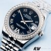 Rolex Datejust 178384 Stainless Steel Blue Diamond Dial 31MM Lady Replica Watch,Stainless steel oyster case 31.0 mm in diameter. features a diamond set bezel,Scratch resistant sapphire crystal with cyclops magnifier. Deep blue dial with roman numerals. Roman Numeral Diamond VI at 6 o’clock.Date calendar at 3 o’clock aperture. Stainless steel jubilee bracelet with fold over clasp.