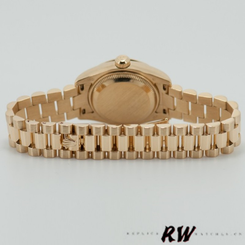 Rolex Datejust 179138 Champagne Jubilee Dial 26MM Lady Replica Watch featuring yellow gold oyster case 26mm in diameter.Yellow gold diamond bezel. Scratch resistant sapphire crystal with Cyclops magnifier.Champagne Jubilee dial with diamond hour markers.Date calendar at 3 o’clock aperture. Yellow gold president bracelet with hidden clasp.