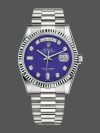 Rolex Day-Date 118239 Diamond Lapis Lazuli Blue Dial 36mm Unisex Replica Watch.36mm white gold case with white gold fluted bezel.Natural blue Lapis Lazuli semi prcious stone dial with diamonds set hour marker. 8 round and 2 baguette cut diamond hour markers. Date display at 3 o’clock position & day display at 12 o’clock position. with a cyclops magnifying lens. White gold President bracelet with white gold hidden fold over clasp. Sapphire crystal. White gold case back.Will fit up to 6.5-Inch wrist.