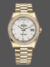 Rolex Day-Date 118348 Yellow Gold White Dial 36mm Unisex Replica Watch. 36 mm Yellow Gold Round Case with Screw Down Crown and Diamonds Bezel .White Dial .Day of the week window displayed at the 12 o’clock position.Date window displayed at the 3 o’clock position with a cyclops magnifying lens.The dial is surrounded by set round brilliant cut diamond bezel, The elegantly designed with Concealed Folding Crownclasp will look great on your wrist.