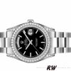 Rolex Day-Date 118389 Diamond Bezel Black Index Dial 36MM Unisex Replica Watch features a 36mm white gold case ,Black Dial with Index Hour Markers with Diamonds Set on Bezel and Lugs, Scratch resistant sapphire crystal with cyclops magnifier. Day of the week window displayed at the 12 o’clock position.Date window displayed at the 3 o’clock position.White gold Presidential bracelet with folding buckle.