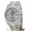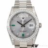 Rolex Day-Date 118389 White Gold Silver Dial 36MM Unisex Replica Watch features a 36mm white gold case ,Silver Dial Set with Diamonds and Emeralds.round brilliant diamond hour markers and baguette Emeralds diamonds at 6 and 9 o’clock,Scratch resistant sapphire crystal with cyclops magnifier. Day of the week window displayed at the 12 o’clock position.Date window displayed at the 3 o’clock position.White gold Presidential bracelet with folding buckle.