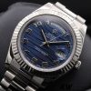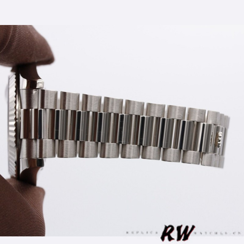 Rolex Day-Date 218239 Wave Blue Dial White Gold 41MM Mens Replica Watch, has a 41mm White gold case that has a solid case back,a screw-down crown, and a fluted white gold bezel.Scratch resistant sapphire crystal with Cyclops magnifier.Wave Blue Dial with Arabic Numerals Hour Markers,Date Window Displayed at 3 O’Clock,Day Window Displayed at 12 O’Clock,White gold three-piece-link Presidential bracelet with a fold-over clasp.