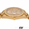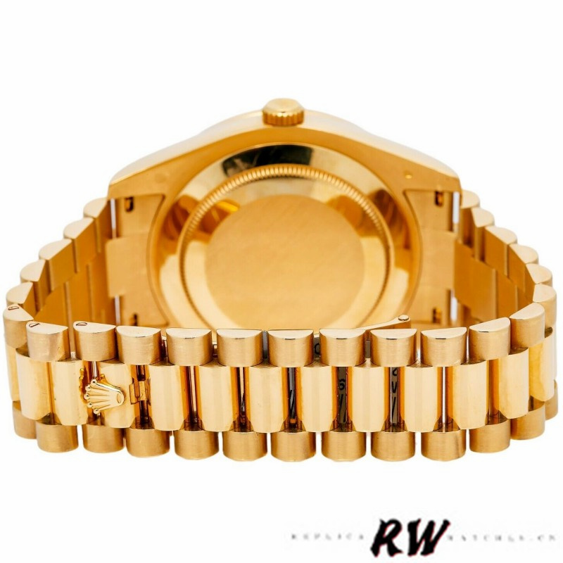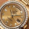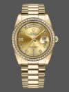 Rolex Day-Date 218348 Champagne Diamonds Dial 41MM Mens Replica Watch,has a 41mm Yellow gold case that has a solid case back with Screw Down Crown and Diamonds Bezel.Scratch resistant sapphire crystal with Cyclops magnifier.Champagne Dial with Diamonds Hour Markers,Date Window Displayed at 3 O’Clock,Day Window Displayed at 12 O’Clock,Yellow gold three-piece-link Presidential bracelet with a fold-over clasp.