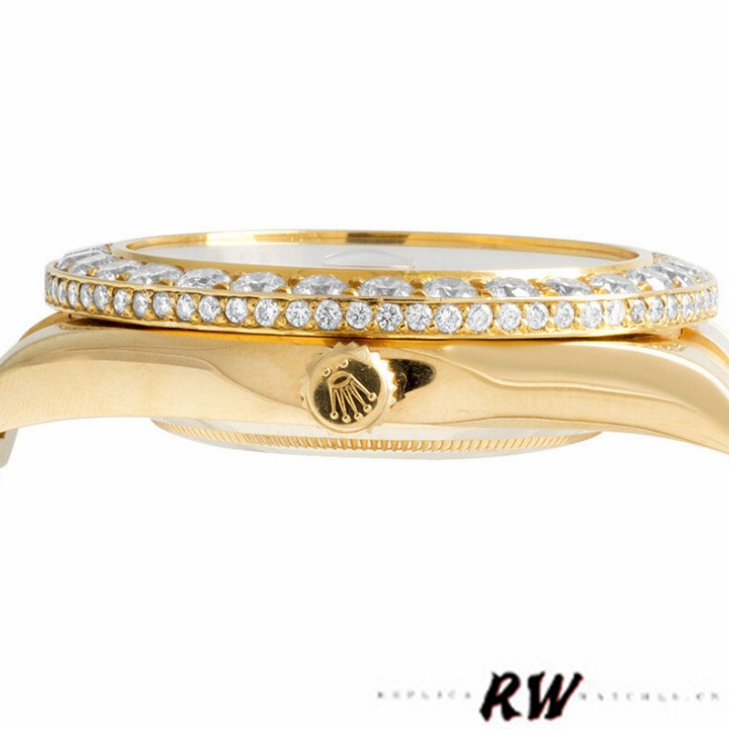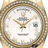 Rolex Day-Date 218348 White Roman Dial 41MM Mens Replica Watch,has a 41mm Yellow gold case that has a solid case back with Screw Down Crown and Diamonds Bezel.Scratch resistant sapphire crystal with Cyclops magnifier.White Dial with Roman Numerals Hour Markers,Date Window Displayed at 3 O’Clock,Day Window Displayed at 12 O’Clock,Yellow gold three-piece-link Presidential bracelet with a fold-over clasp.