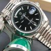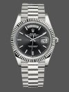 Rolex Day-Date 228239 Black Index Dial Fluted Bezel 40mm Mens Replica Watch, featuring a 40mm White Gold case, solid case back with screw-down crown and fluted bezel. Scratch-resistant sapphire crystal with Cyclops magnifying glass.Black Dial Index Hour Markers, date window at 3 o’clock, day of the week window at 12 o’clock,White Gold three-piece presidential bracelet with deployant clasp.