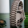 Rolex Day-Date 228239 Silver Baguette Diamond Dial Fluted Bezel 40mm Mens Replica Watch, featuring a 40mm White Gold case, solid case back with screw-down crown and fluted bezel. Scratch-resistant sapphire crystal with Cyclops magnifying glass.Silver Dial with 10 Baguette-Cut Diamond Hour Markers, date window at 3 o’clock, day of the week window at 12 o’clock,White Gold three-piece presidential bracelet with deployant clasp.