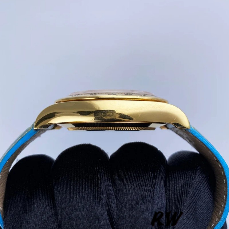 Rolex Daytona 116518 Blue leather strap MOP Dial 40mm Mens Replica Watch. 40mm yellow gold case with yellow gold tachymeter bezel. Mother of pearl dial with gold hands and Roman numeral hour marker. Three sub-dials. Small seconds hand at 6 o’clock. 30-minute counter at 3 o’clock. 12-hour counter at 9 o’clock. Minute maker on the outer dial. Blue leather strap with yellow gold fold over clasp with safety. Will fit up to 6.5-Inch wrist.