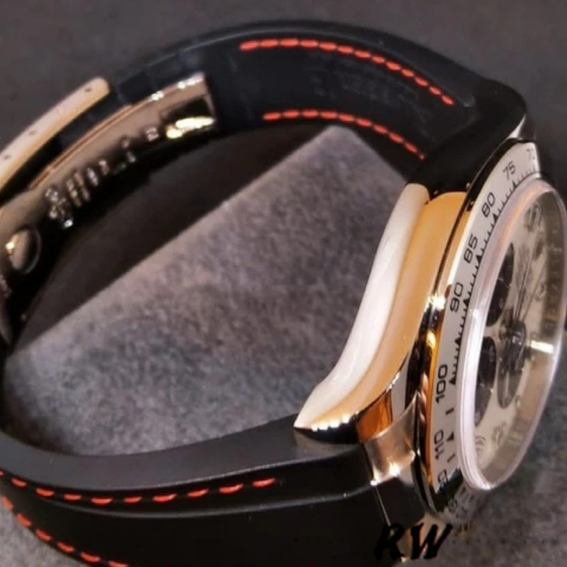Rolex Daytona 116519 “Panda” Dial Black Rubber Strap 40mm Mens Replica Watch has a white gold 40mm round case. Polished stainless steel tachymeter bezel. Large luminescent Arabic hour indicators and black subdials with white and red accents. White dial with hours, one minute, very smooth seconds hand, three functional black sub-dials, Arabic numeral hour markers. Black RubberB strap, completely hypoallergenic, with white gold deployant clasp.