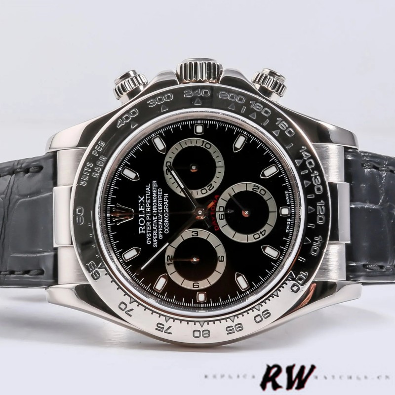 Rolex Daytona 116519 White Gold Black Dial 40mm Mens Replica Watch.40mm Stainless Steel case and bezel.Minute markers around the outer rim. Black dial. Black Leather Strap with deployant clasp. Luminous Index.The bright luminous sticks marked on the dial will light up when you leave the light.The hands of the replica watch is silver-tone which is pretty cool and fashionable.