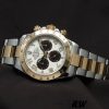 Rolex Daytona 116523 White Arabic Panda Dial 40mm Mens Replica Watch has a Stainless Steel 40 mm Round Case with Screw Down Crown and a Yellow Gold Bezel. Racing dial with bold black chronograph sub-dials and gold arabic hour markers on a vintage off-white background.Luminous yellow gold baton hands. Stainless steel and yellow gold oyster bracelet with flip-lock clasp.