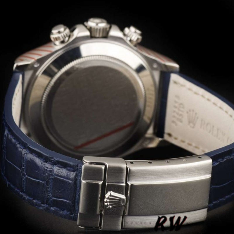 Rolex Daytona 116589BR Sodalite Dial Baguette Diamond Bezel 40mm Mens Replica Watch.40mm White Gold case.rare sodalite dial with 8 applied round brilliant cut diamond hour markers , 30 minute recorder at 3 0’clock, small seconds at 6 0’clock, 12 hour recorder at 9 0’clock, a fixed white gold bezel set with 24 baguette cut sapphires, The sapphire bezel is also perfect.Blue leather strap with a white gold oysterlock deployant clasp, sapphire glass.
