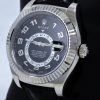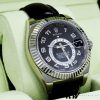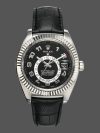 Rolex Sky-Dweller 326139 Black Dial Leather Strap 42MM Mens Replica Watch,42mm white gold case, screw-down back, screw-down crown, fluted bezel with bidirectional rotatable Rolex Ring Command, scratch-resistant sapphire crystal with cyclops lens over the date and double anti-reflective coating, Black dial,second time-zone displayed via off-center rotating disc, Saros annual calendar with date at 3 o’clock and month indicated in discrete apertures at each of the 12 hour marks, black leather strap, folding Oysterclasp buckle.