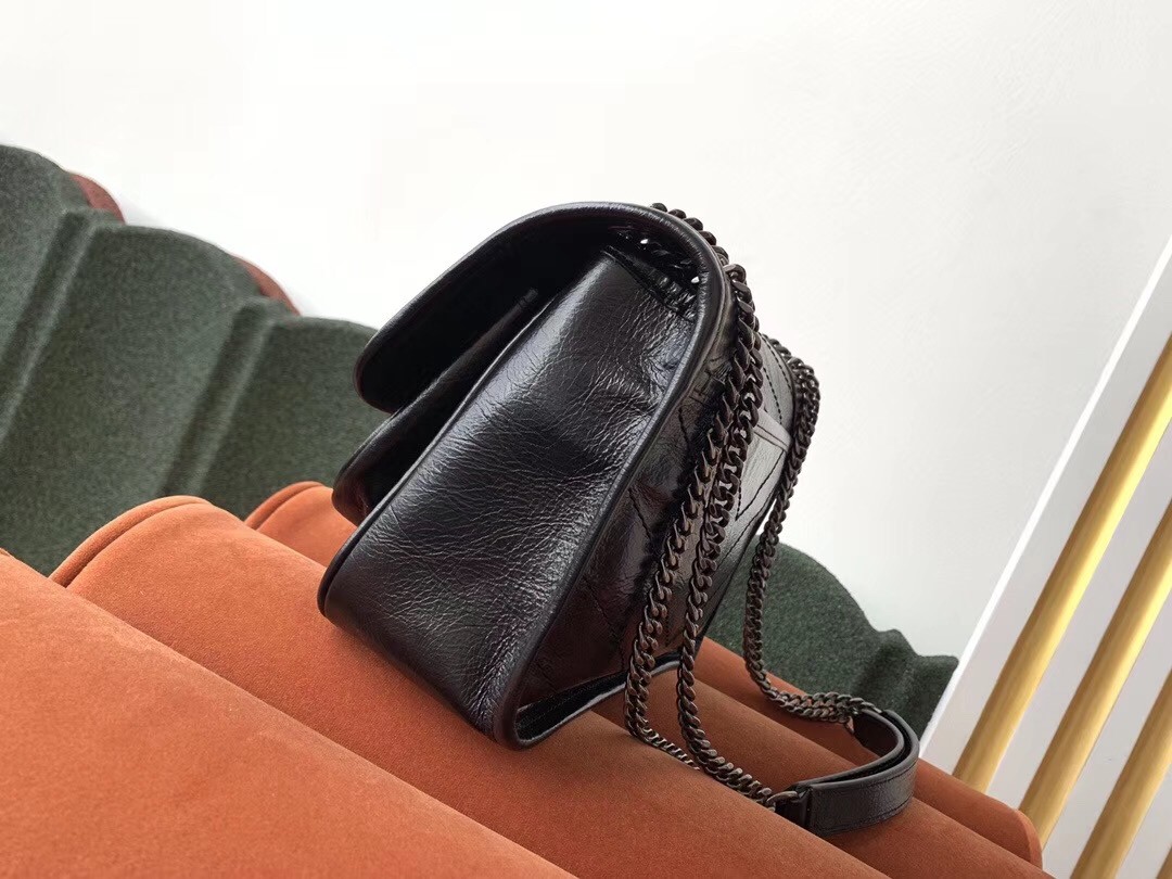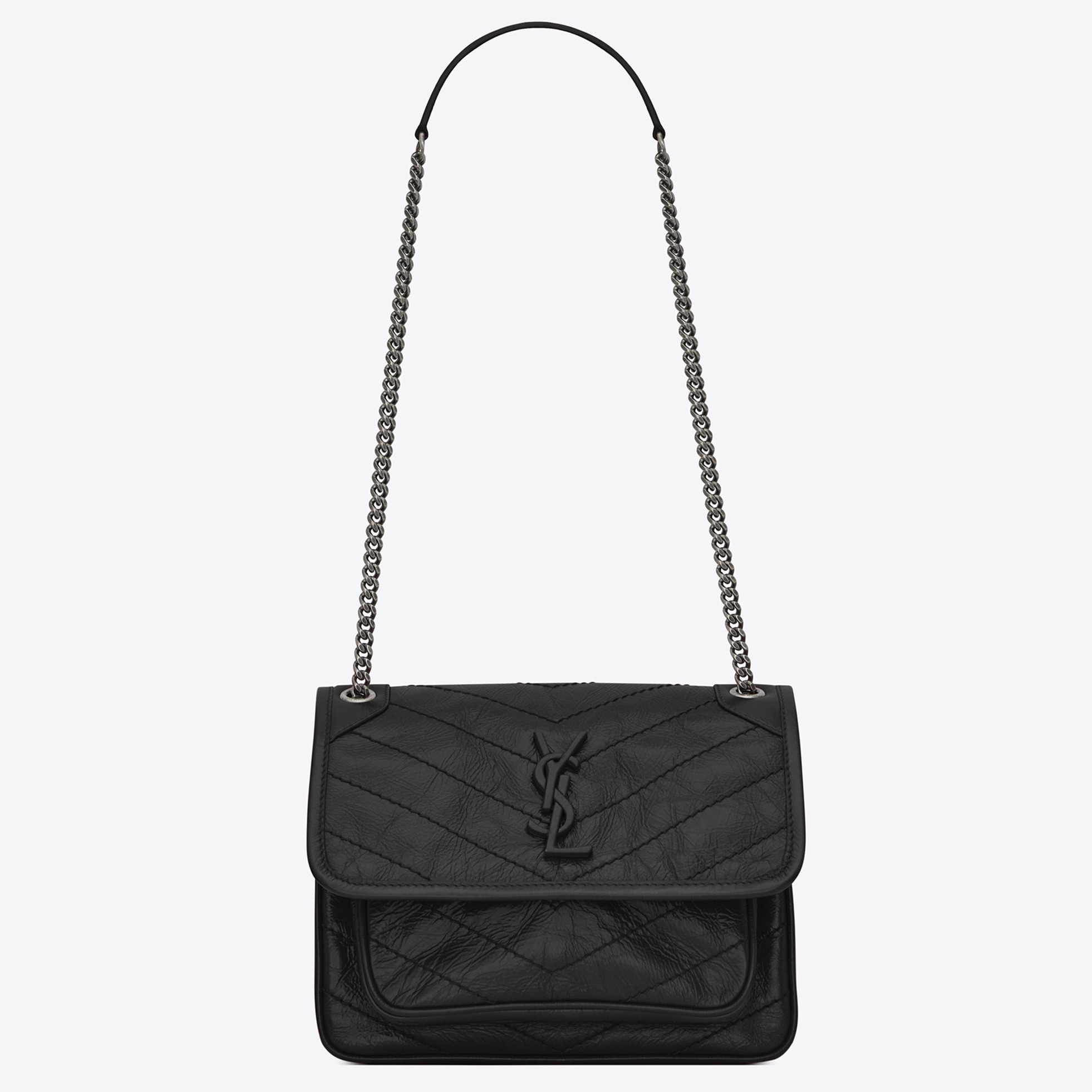 Under the creative helm of Anthony Vaccarello, Saint Laurent’s latest edit works with muted tones and subtle patterns to create pieces that retain the Parisian labels celebrated luxury. Rendered in crinkled leather with a slouchy silhouette, the Niki shoulder bag is finished with the iconic interlocking monogram at the clasp. Suspended from a curb-chain strap, its spacious build boasts multiple interior compartments.