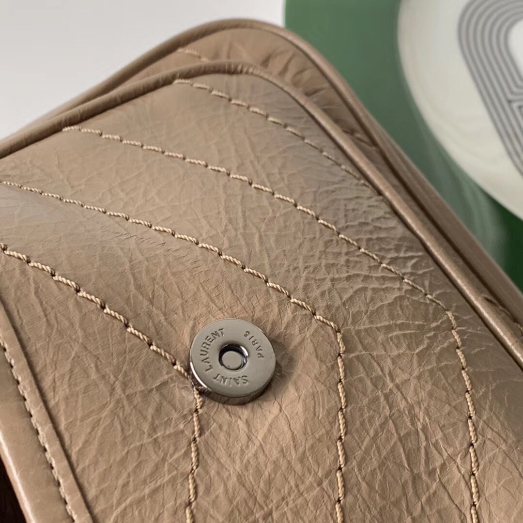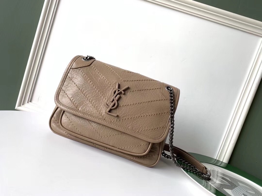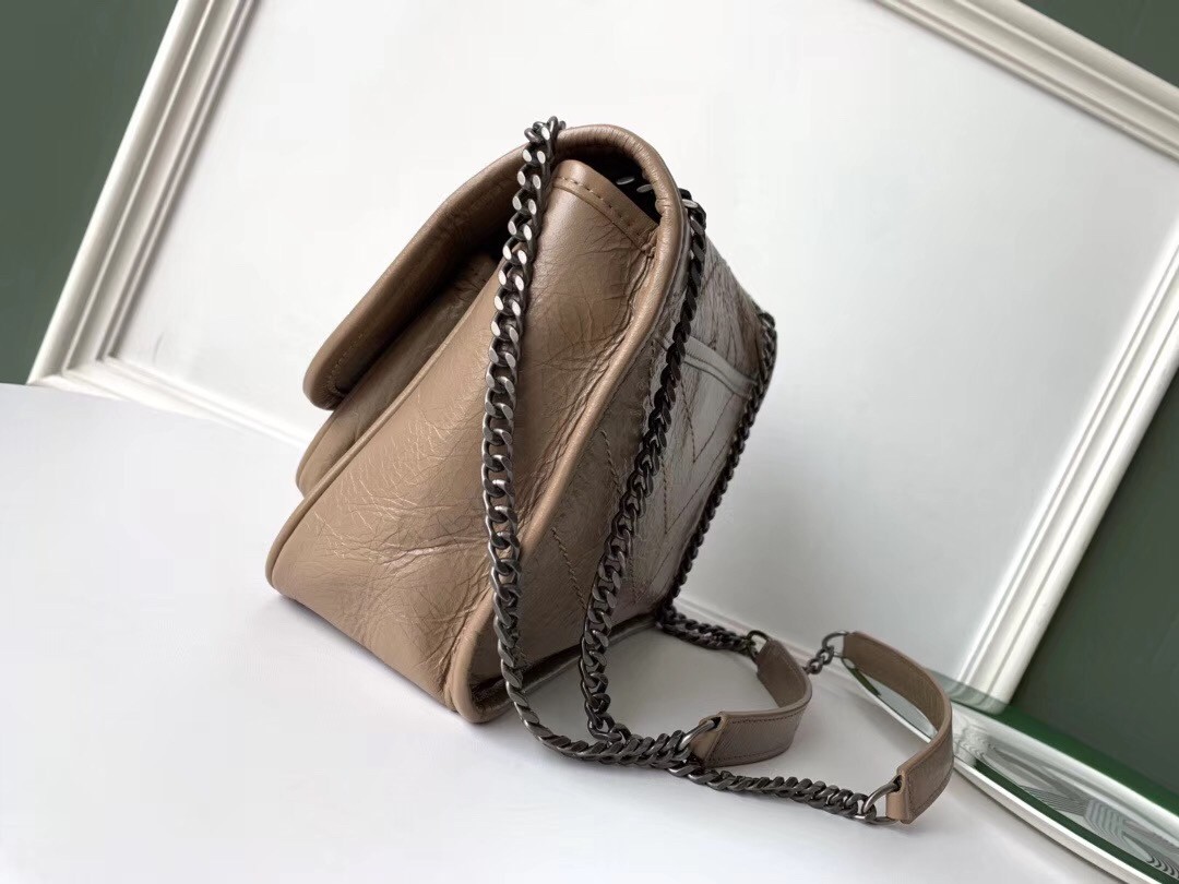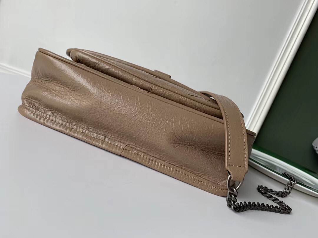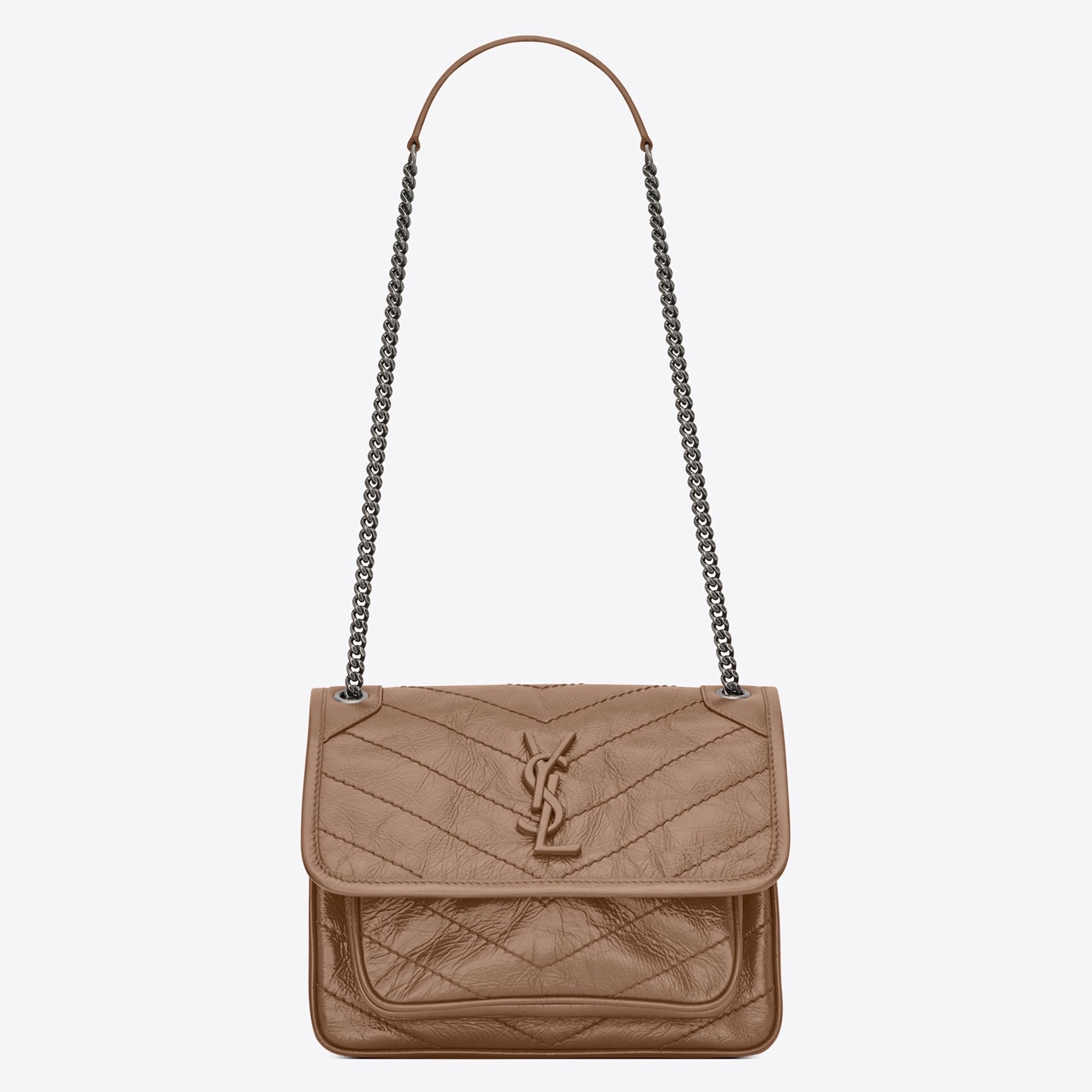 Under the creative helm of Anthony Vaccarello, Saint Laurent’s latest edit works with muted tones and subtle patterns to create pieces that retain the Parisian labels celebrated luxury. Rendered in crinkled leather with a slouchy silhouette, the Niki shoulder bag is finished with the iconic interlocking monogram at the clasp. Suspended from a curb-chain strap, its spacious build boasts multiple interior compartments.