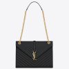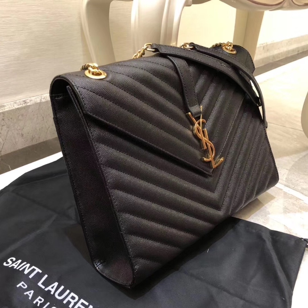 Shaped like a large envelope, Saint Laurent’s large shoulder bag has been made from quilted grain de poudre embossed leather. It’s strung from a sliding chain strap in gold to match the iconic ‘YSL’ hardware and opens to reveal a canvas lining. Slip your phone or travel pass into the handy zipped pocket.