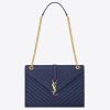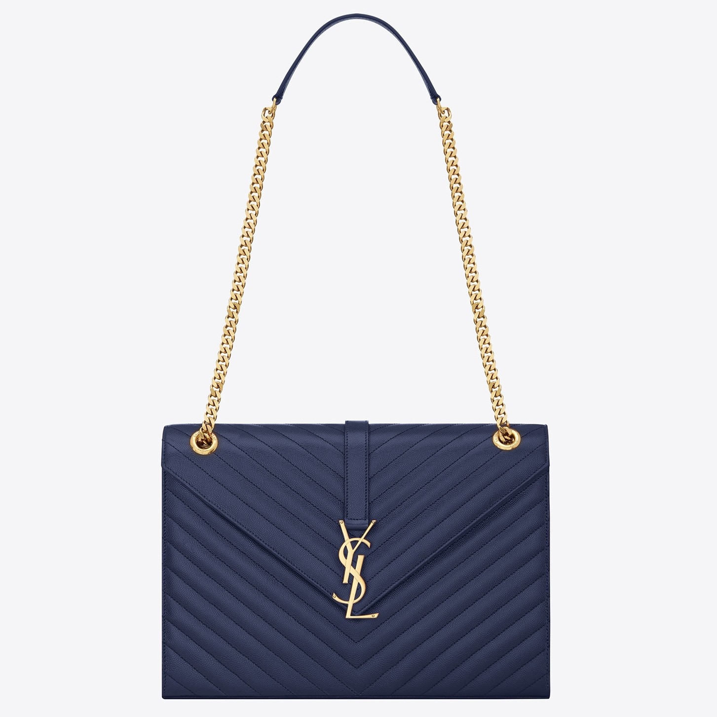 Shaped like a large envelope, Saint Laurent’s large shoulder bag has been made from quilted grain de poudre embossed leather. It’s strung from a sliding chain strap in gold to match the iconic ‘YSL’ hardware and opens to reveal a canvas lining. Slip your phone or travel pass into the handy zipped pocket.