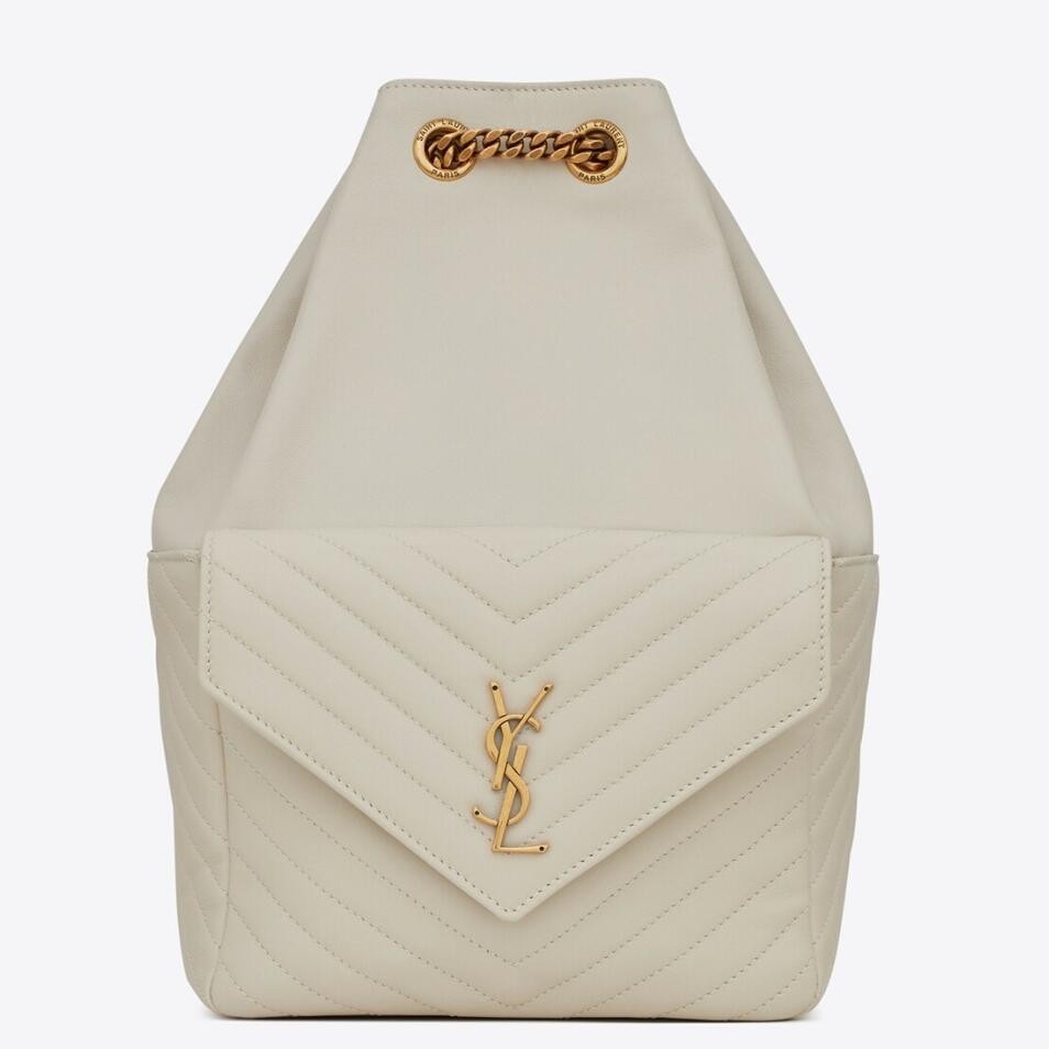 Saint Laurent’s Joe backpack is crafted from supple lambskin with signature chevron quilting and topped with the ‘YSL’ monogram. It’s embellished with a chain-link drawstring. Keep your essentials stashed in the front pouch for easy access and the rest secured in the interior zipped pocket.