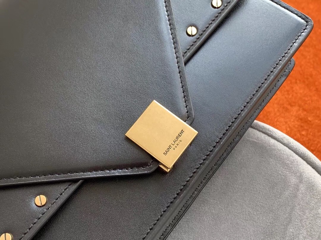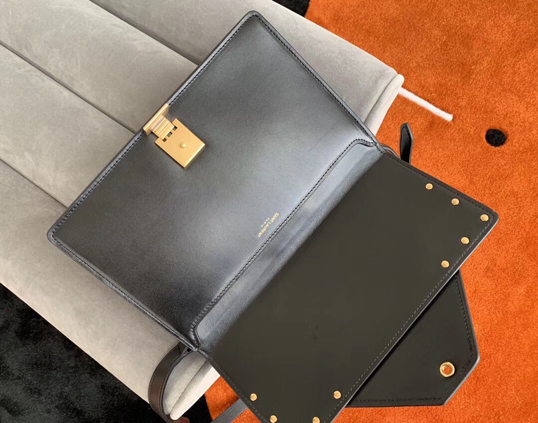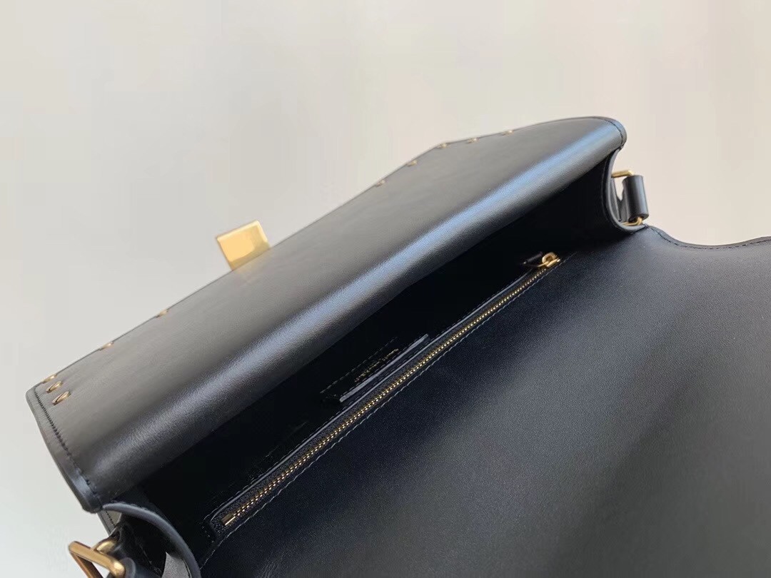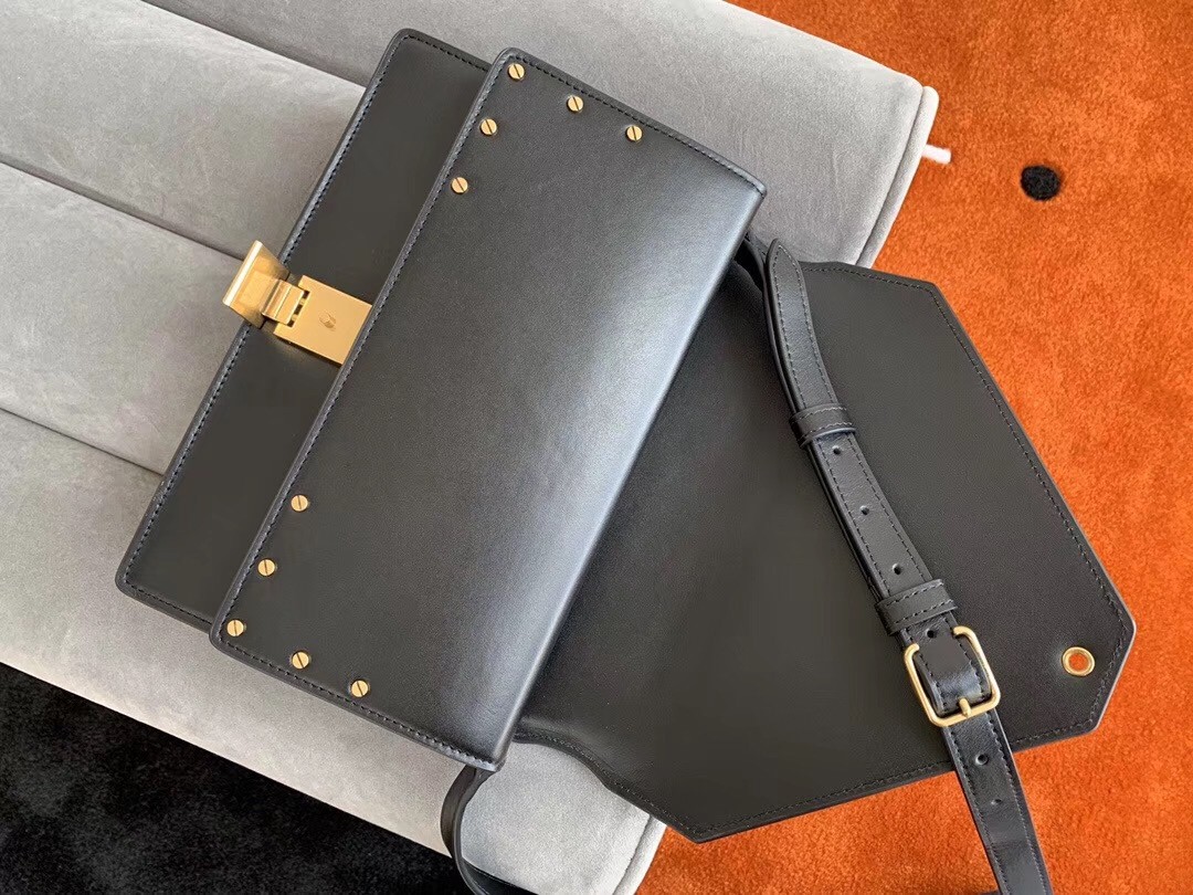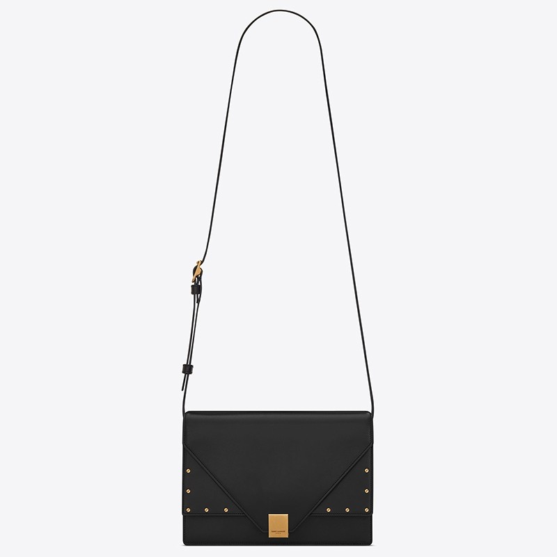Crafted from smooth leather to a streamlined shape, Saint Laurent’s black Margaux bag is a timeless style. The front flap is fitted with a logo-engraved buckle, while gold-tone metal studs channel the Parisian label’s elegant edge. Adjust the shoulder strap to showcase it against a printed coat.