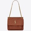 Under the creative helm of Anthony Vaccarello, Saint Laurent’s latest edit works with muted tones and subtle patterns to create pieces that retain the Parisian labels celebrated luxury. Rendered in crinkled leather with a slouchy silhouette, the Niki shoulder bag is finished with the iconic interlocking monogram at the clasp. Suspended from a curb-chain strap, its spacious build boasts multiple interior compartments.