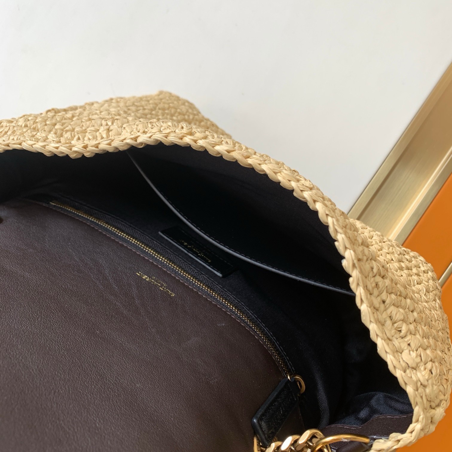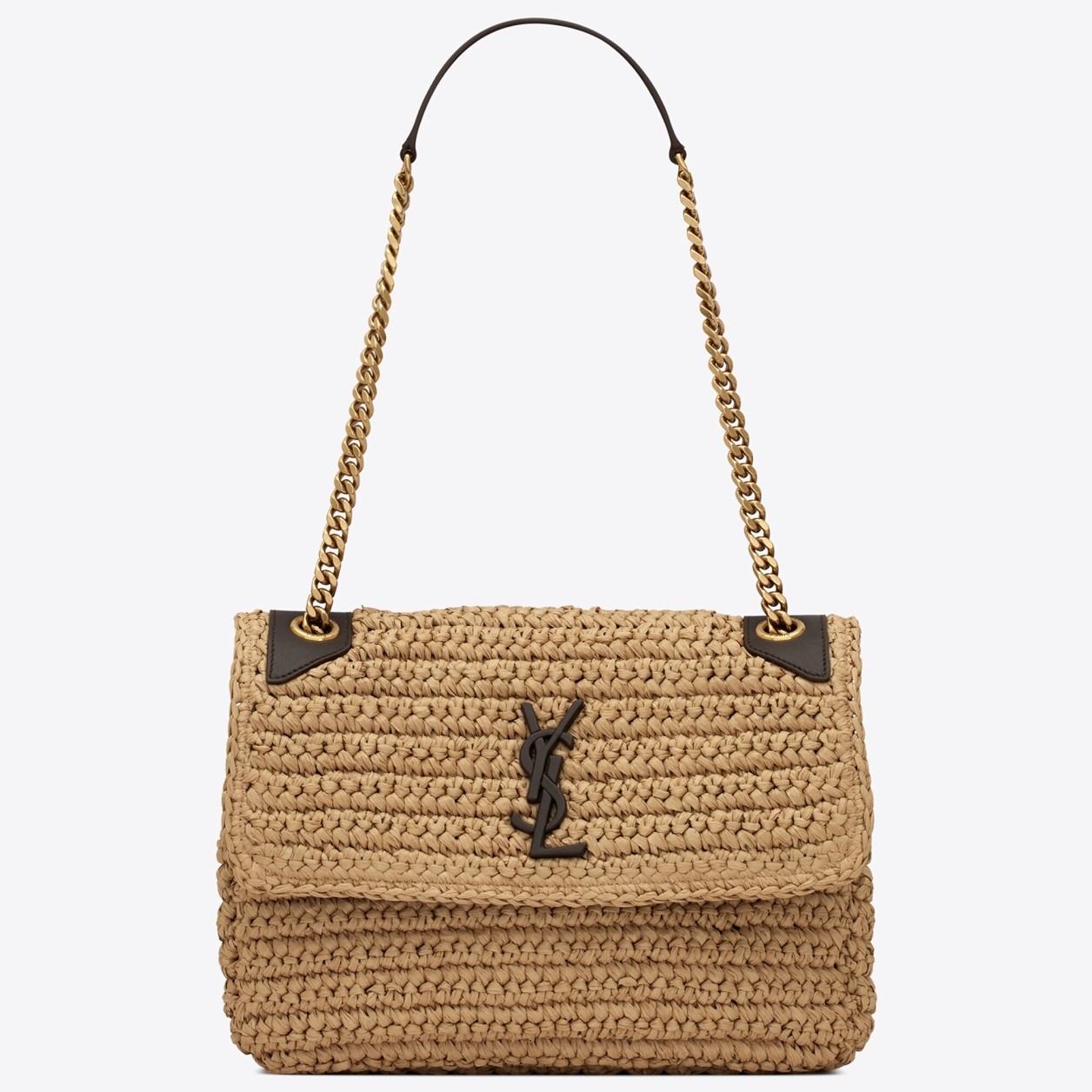 Saint Laurent updates its Niki medium bag for the new season in beach-appropriate raffia. Trimmed with supple leather, it’s suspended on a sliding gold chain so you can alter the drop and is topped with the maison’s interlocking logo plaque. The compartmented interior means you can keep your belongings organized.