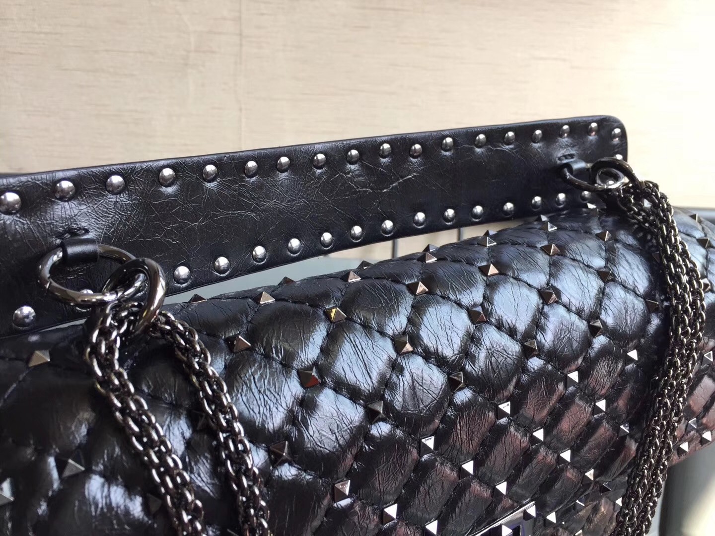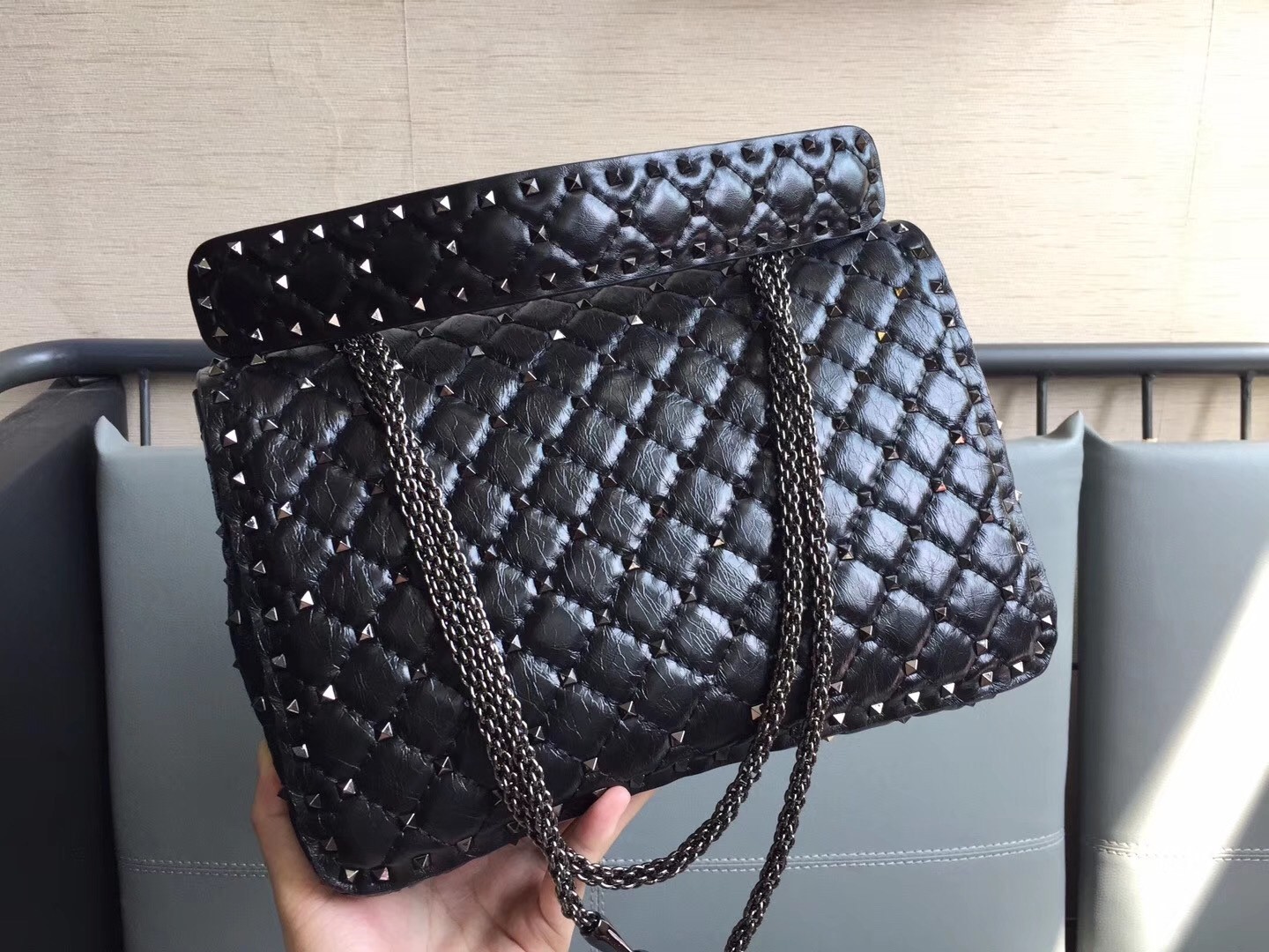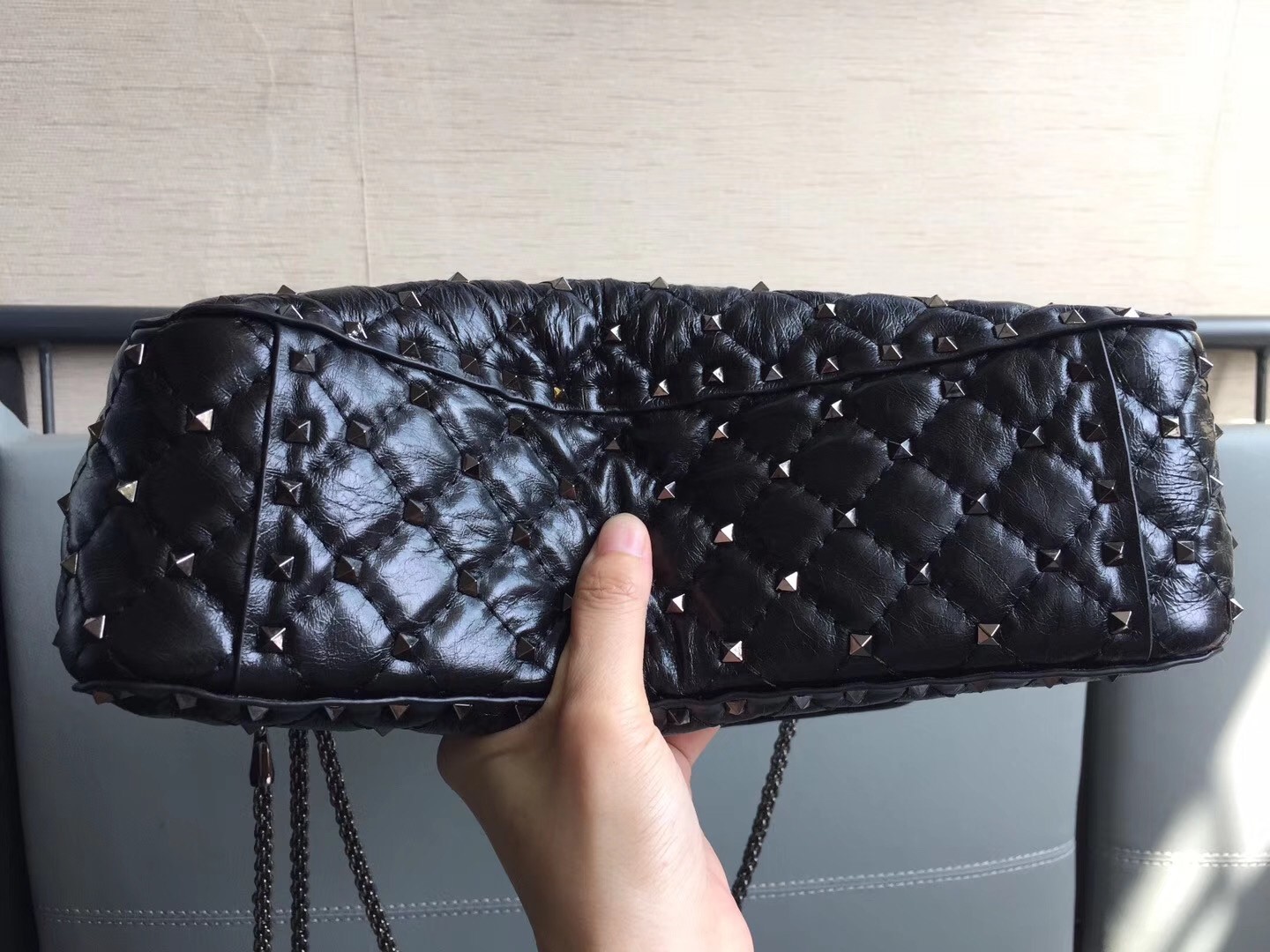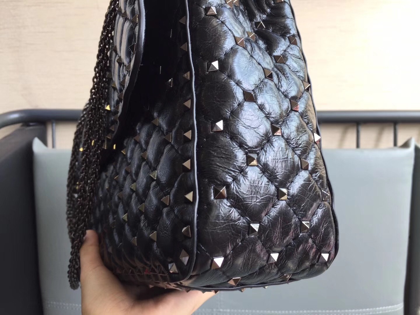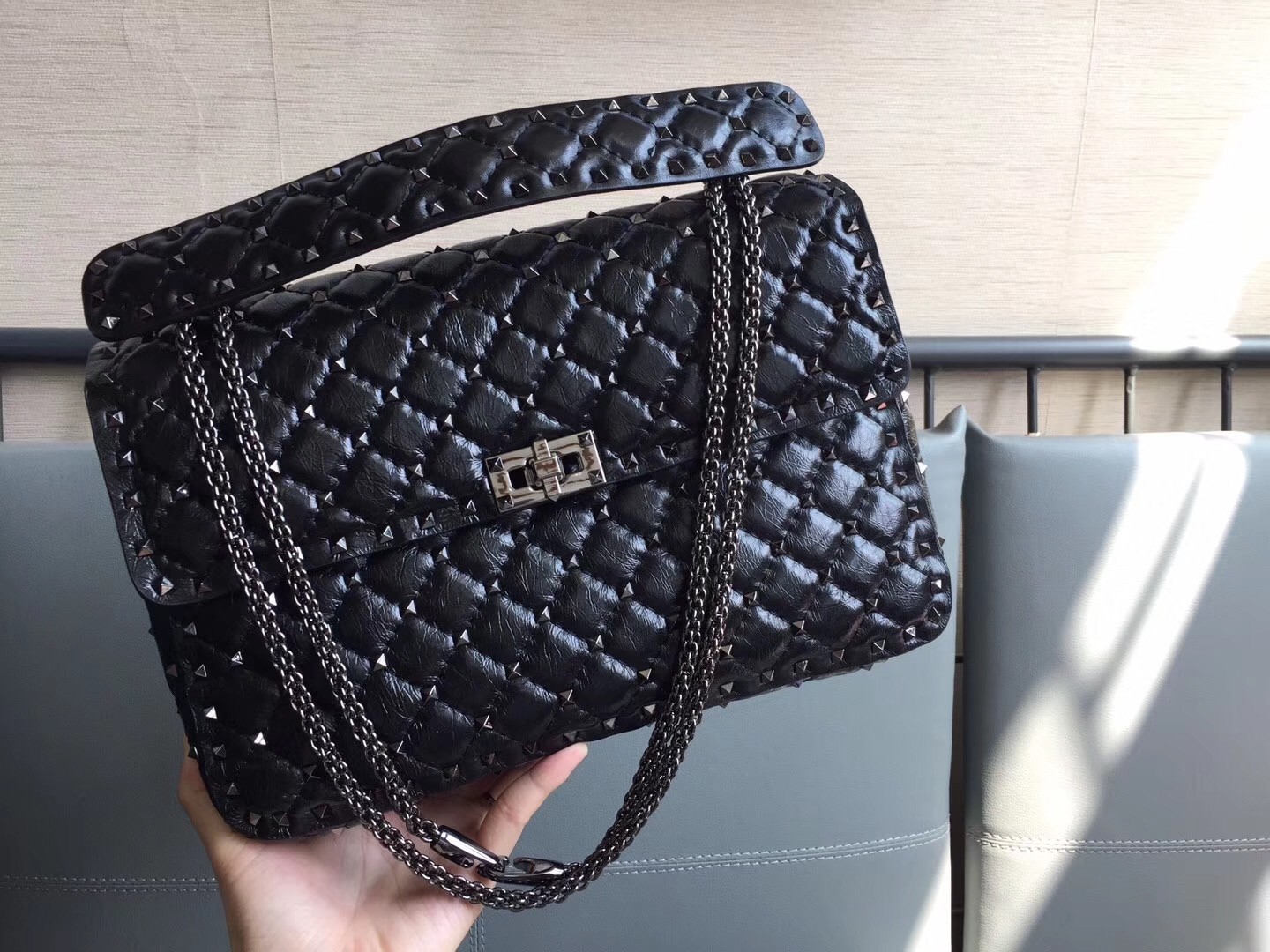 Valentino Garavani’s large shoulder bag darkly glistens with tiny Rockstuds, each hand-applied and polished at the label’s atelier. You won’t find a more practical finish for an everyday handbag – the black cracked-leather hides scuffs and scratches so easily. Tuck the chain strap into the suede-lined interior when you’re going straight from work to evening drinks.