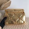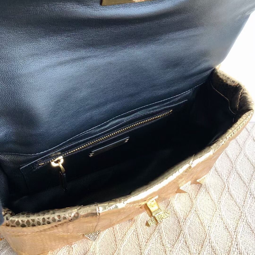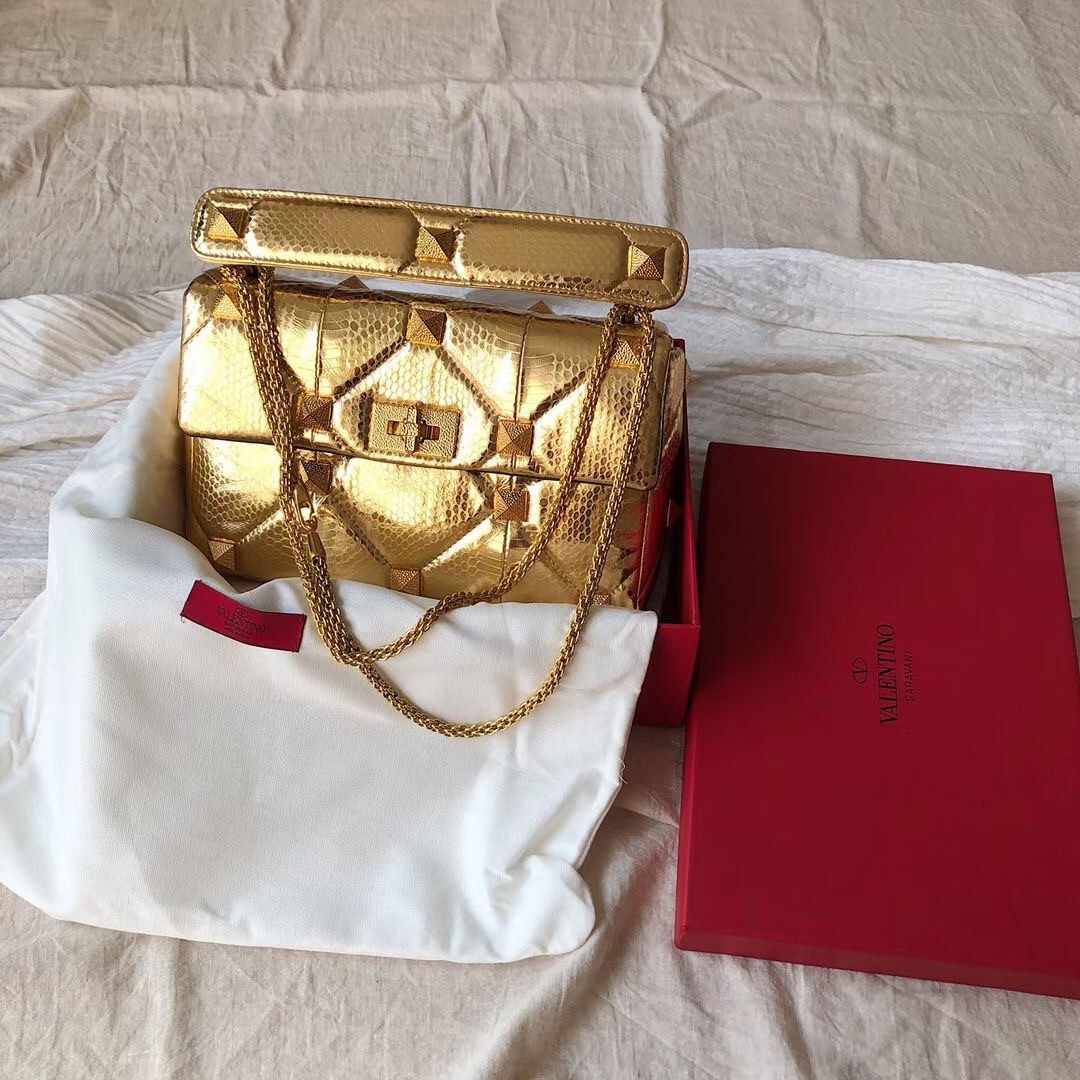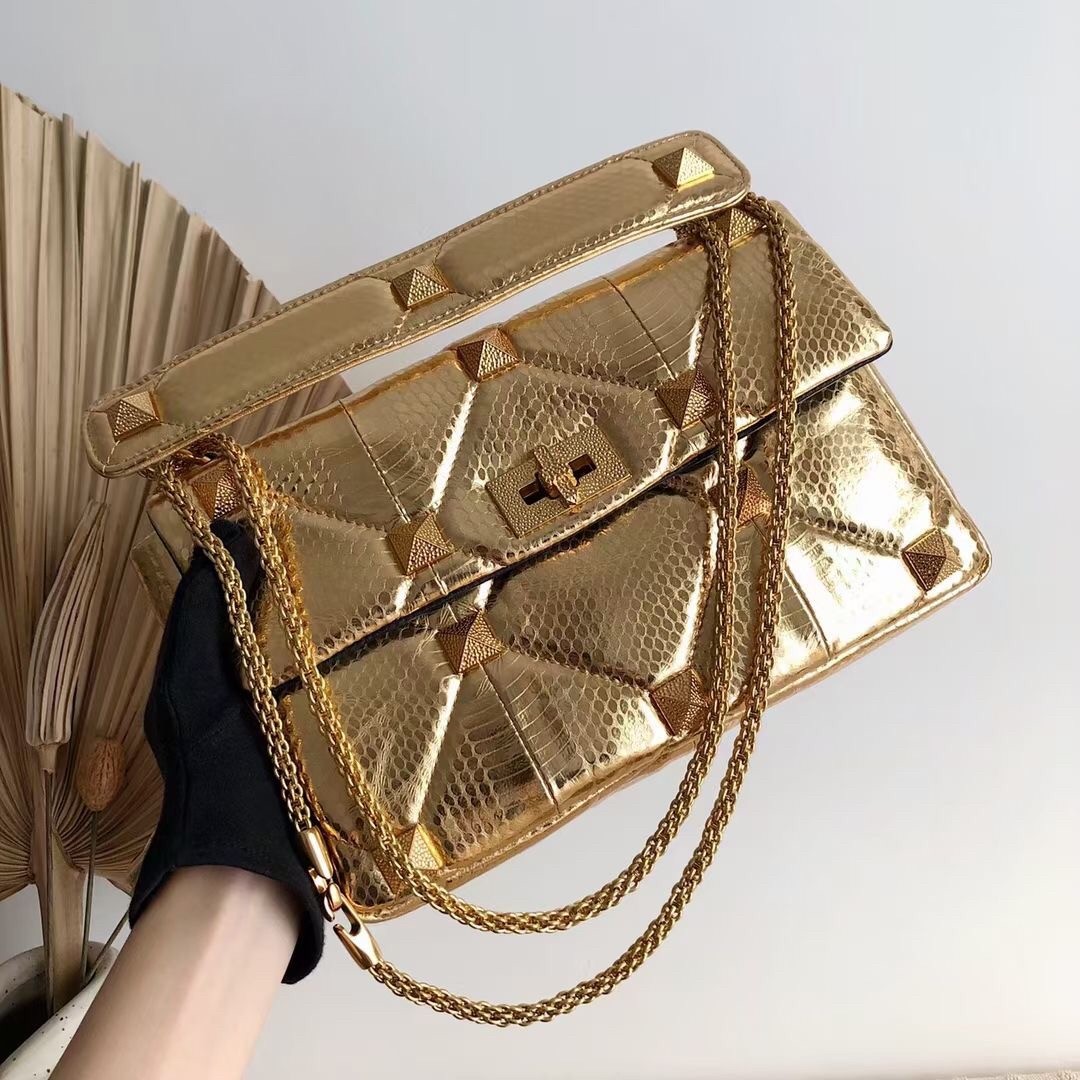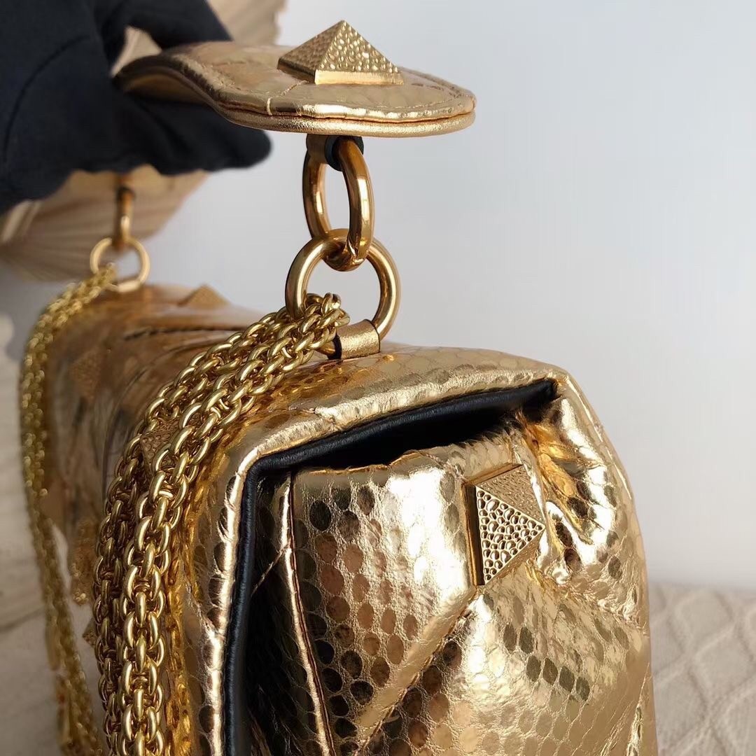 Remaining faithful to Valentino Garavani’s celebrated heritage, the Roman Stud shoulder chain bag is adorned with the House’s iconic Rockstuds. Crafted from metallic leather, the textured design ?C including the hammered hardware and quilted stitching ?C gives the piece a multidimensional finish, tapping into the label’s coveted feminine-meets-rock aesthetic.