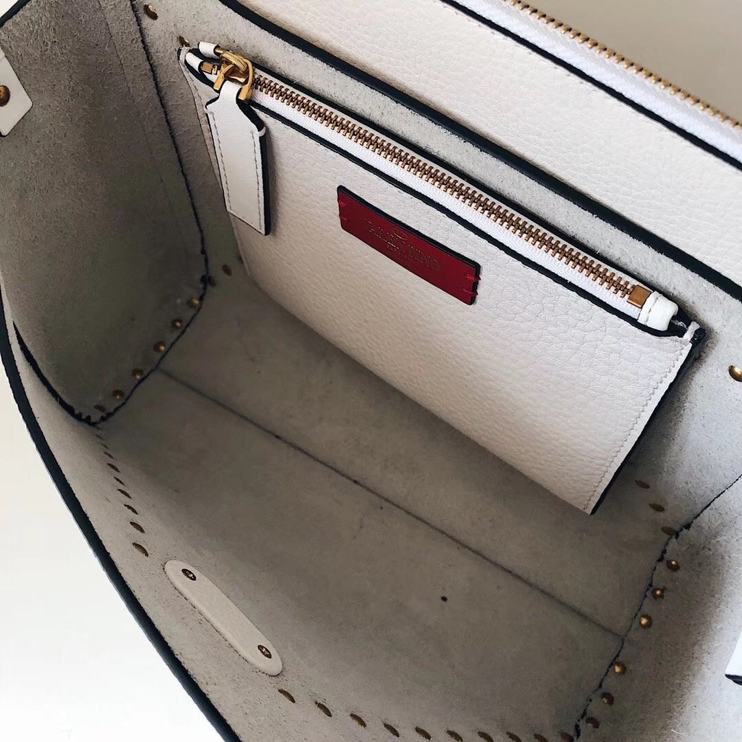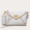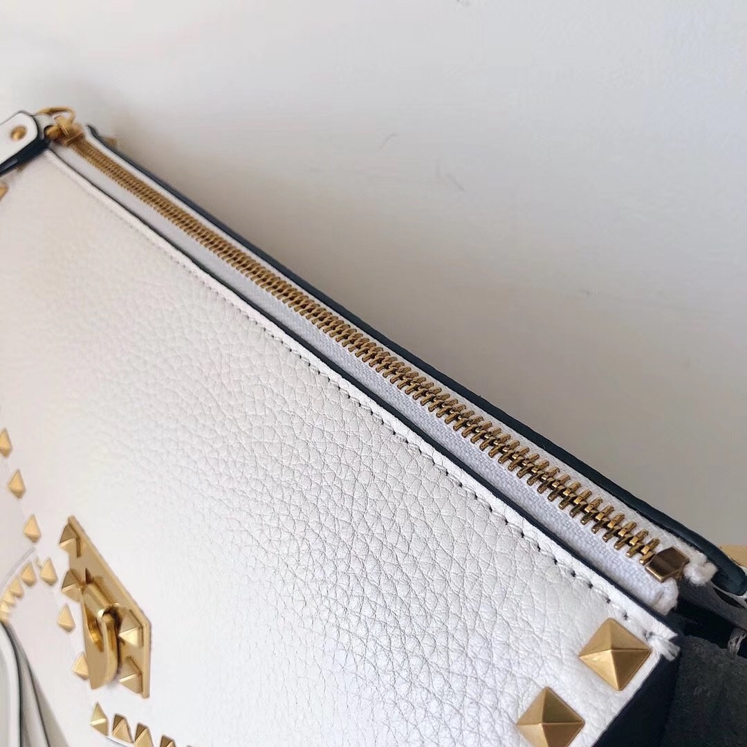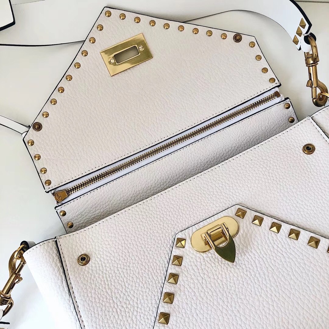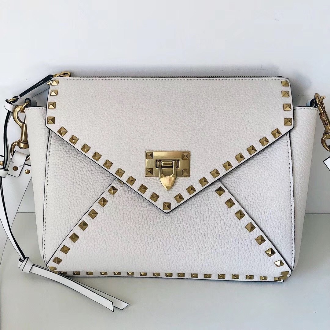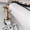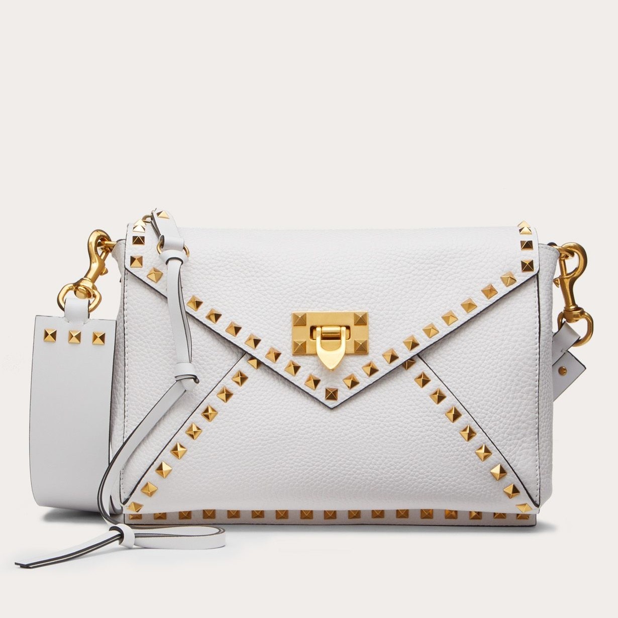 With its white color and studs, this Valentino Garavani Rockstud Hype shoulder bag reflects the spirit of this Italian fashion house. Featuring a contemporary envelope design, this accessory stands out with its studs and black lanyard attached to the zipper. Its oversized shoulder strap and snap hooks make it a unique accessory, perfect with skinny pants and a pair of thick-soled sneakers.