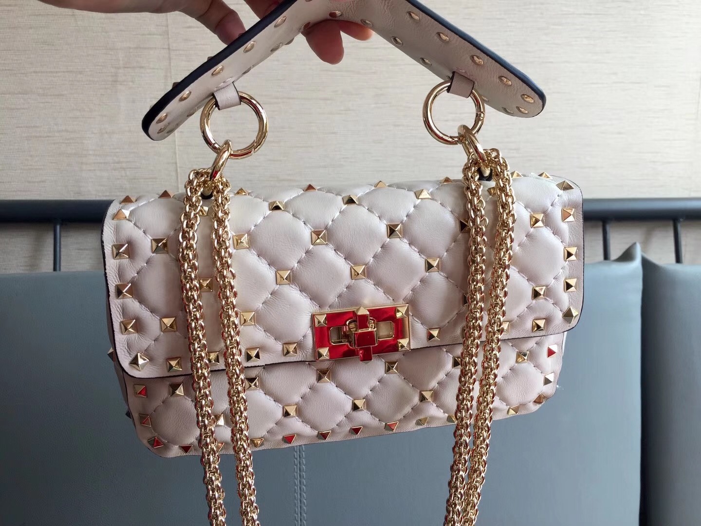 Valentino Garavani’s ‘Rockstud’ embellishments first debuted in the early 2000s and are still coveted after all these years. Crafted from nappa leather, this quilted bag is sized to fit the essentials and finished with the gilded pyramid studs nestled neatly in the tactile quilting. Carry it by the top handle or attach the shoulder strap to drape it cross-body.
