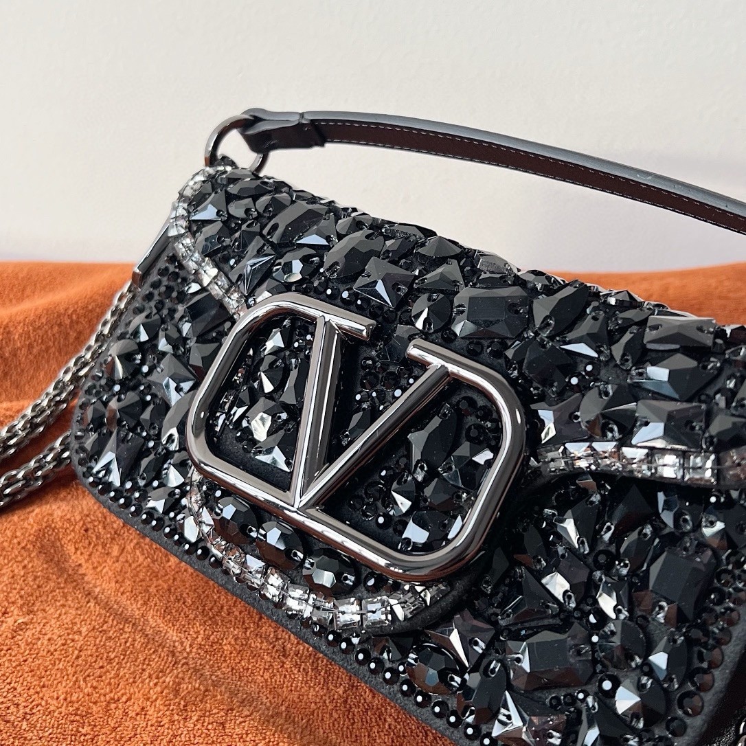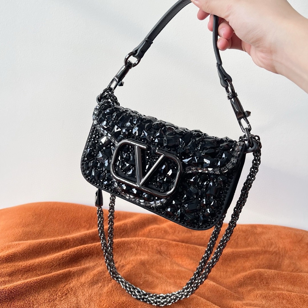Transforming from a dainty handheld accessory to a practical cross-body style with the easy attachment of a chain strap, the Valentino Garavani Loc?? bag covered in crystals is one that will see you from day to dark with ease. The VLOGO that sits proudly atop the piece ?C an immediate focal point ?C indicates your allegiance to the esteemed House, all while complementing your shiniest jewellery in the process.