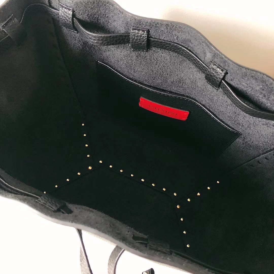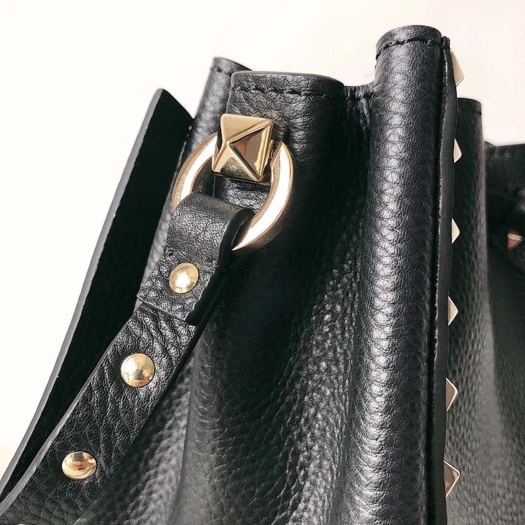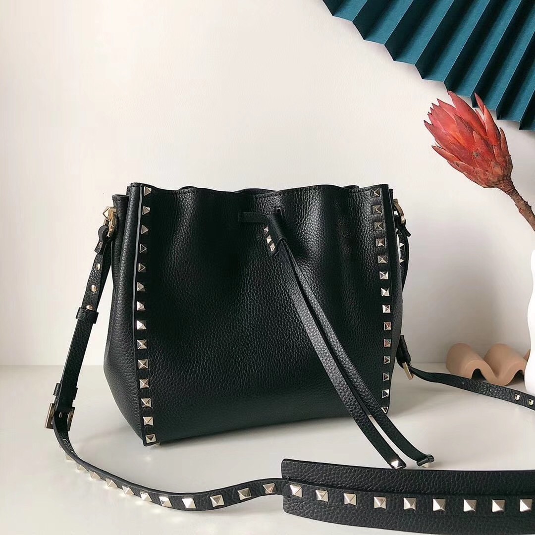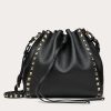 Valentino Garavani’s bucket bag is outlined with rows of Rockstuds that are polished and applied by hand at the brand’s atelier. It’s been made in Italy from unlined textured-leather, so it scrunches effortlessly at the drawstring brim. The small size will fit all the essentials, including a continental wallet or large smart phone.