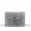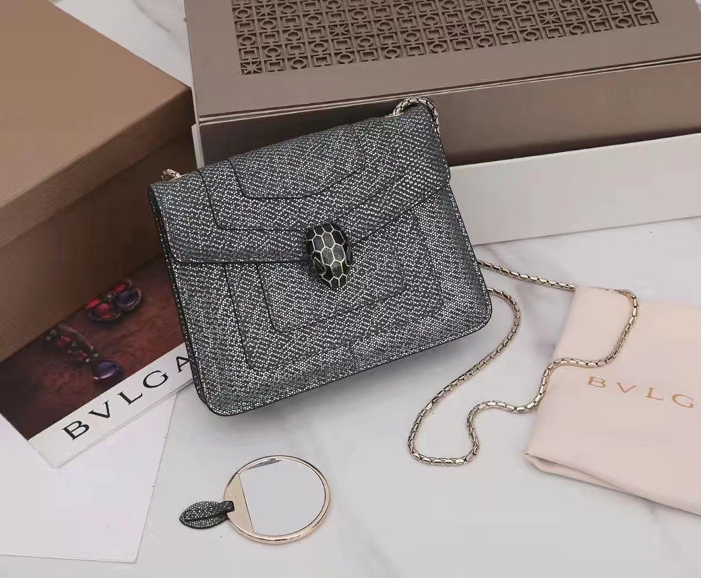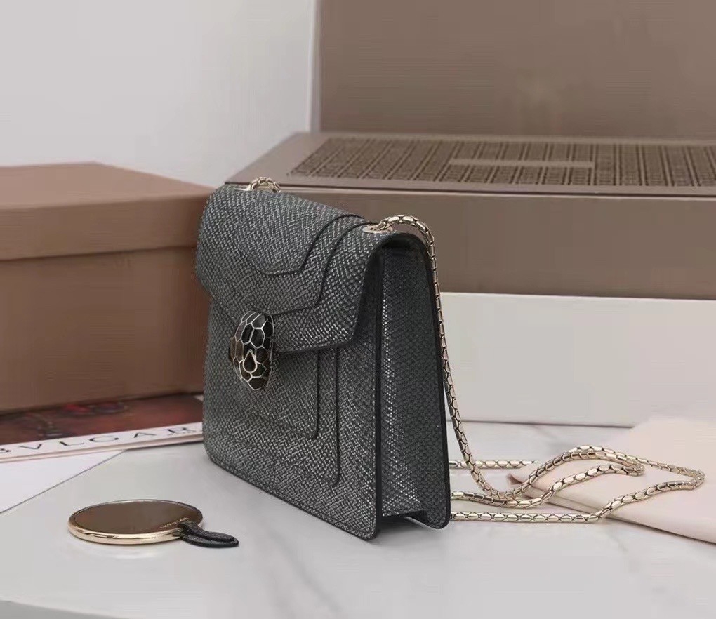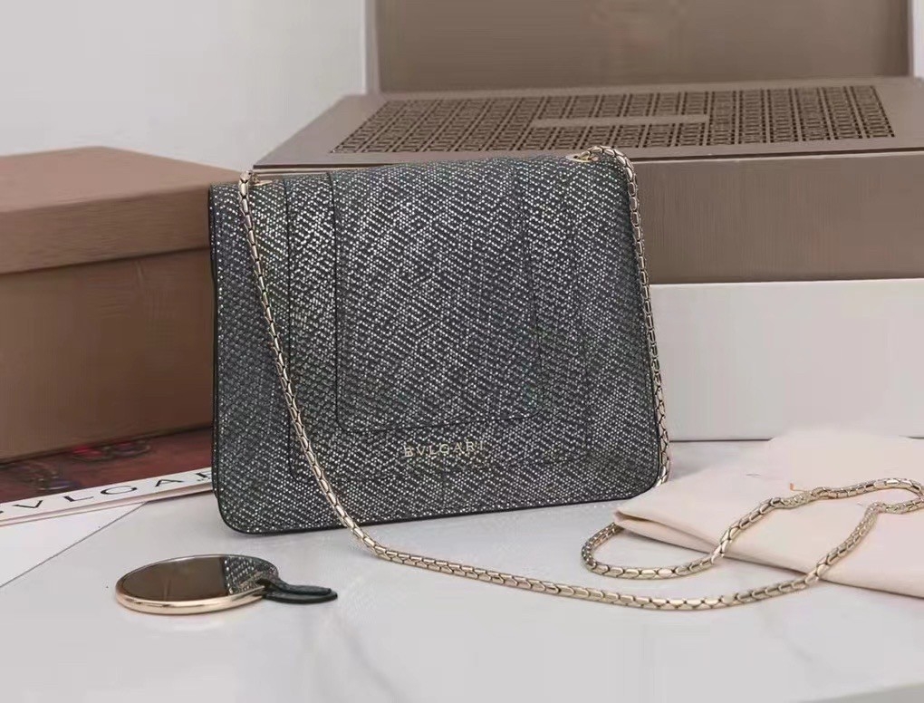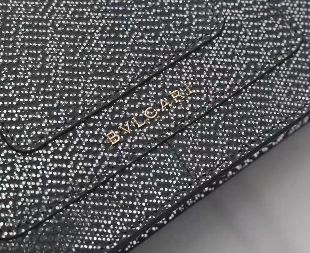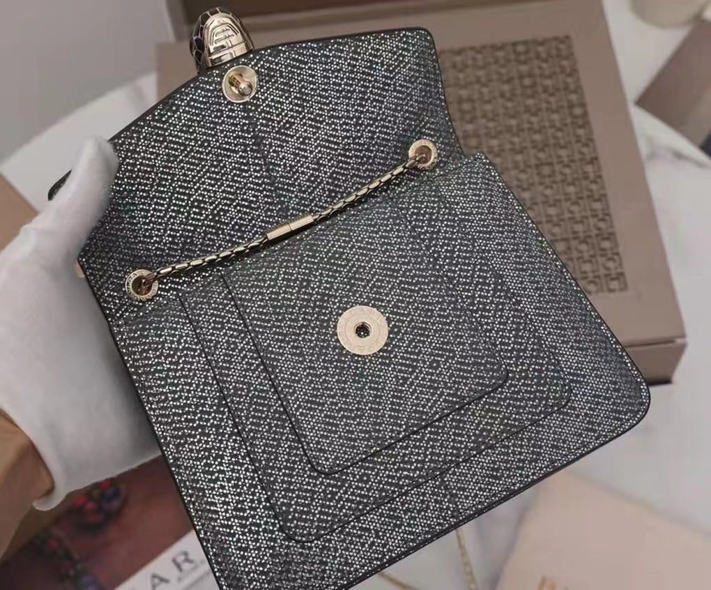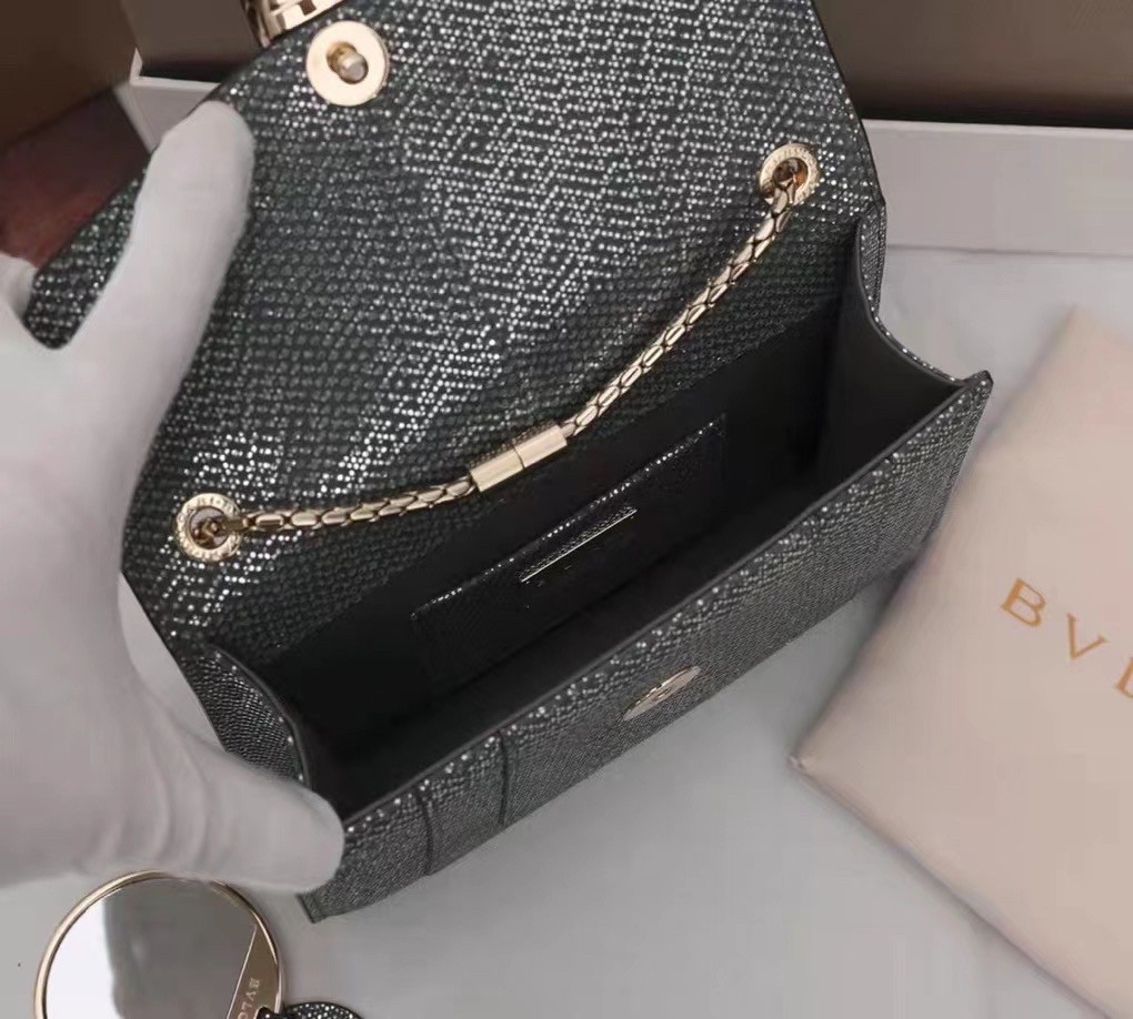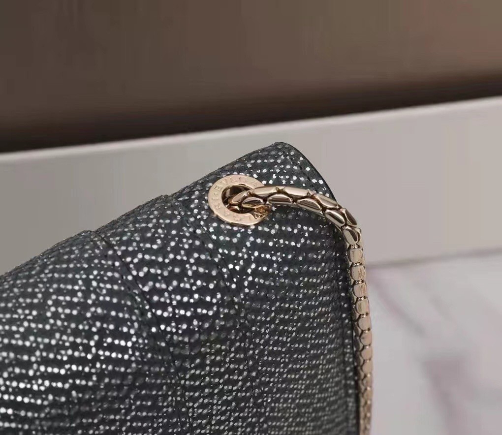Crafted in precious charcoal diamond karung skin with a metallic finishing, the Serpenti Forever crossbody bag epitomizes the mastery of Bvlgari artisans in shaping precious materials into timeless creations. The iconic snakehead closure hypnotizes with its glitter charcoal diamond and shiny black enamel scales and seductive black onyx eyes.