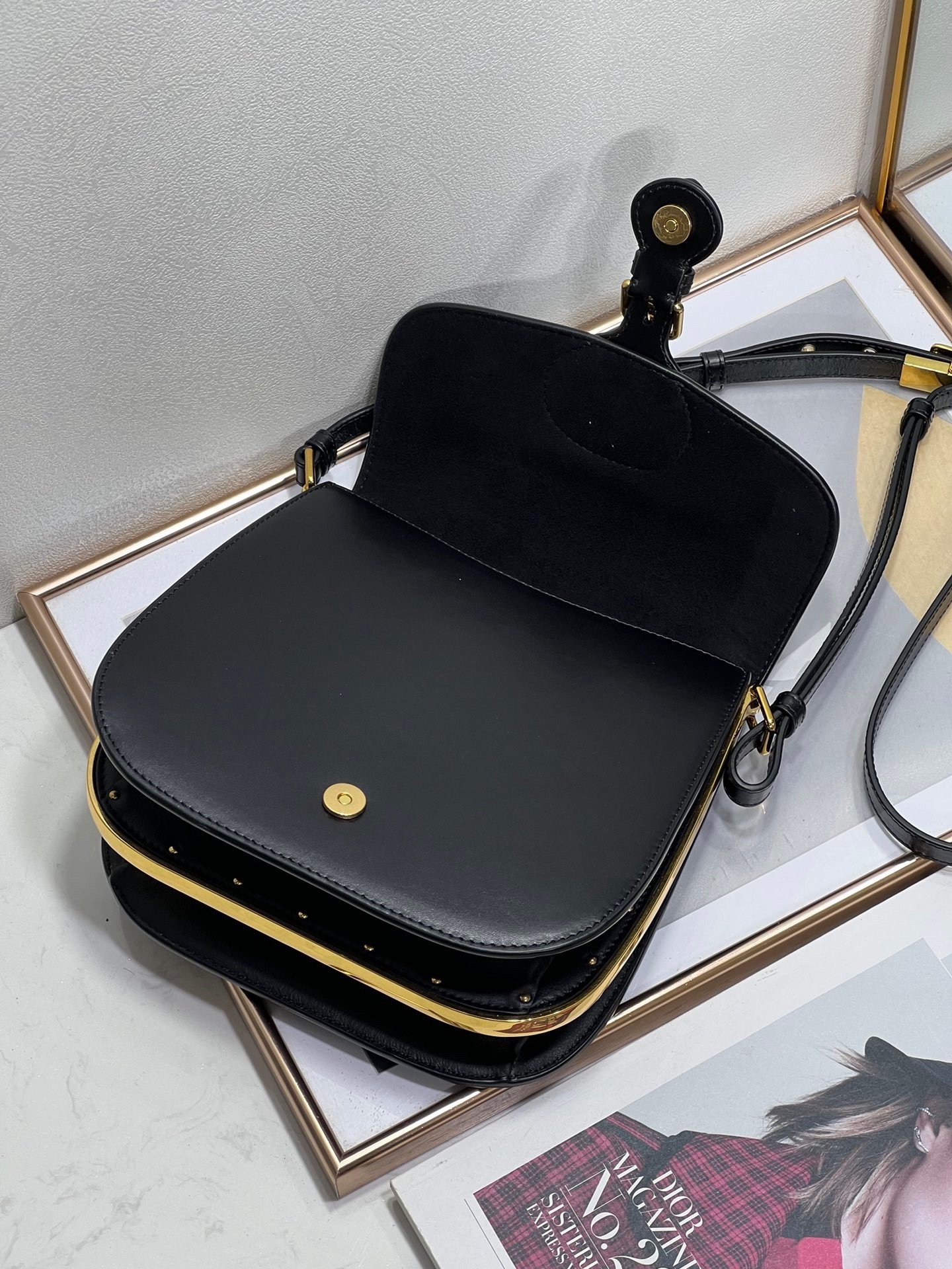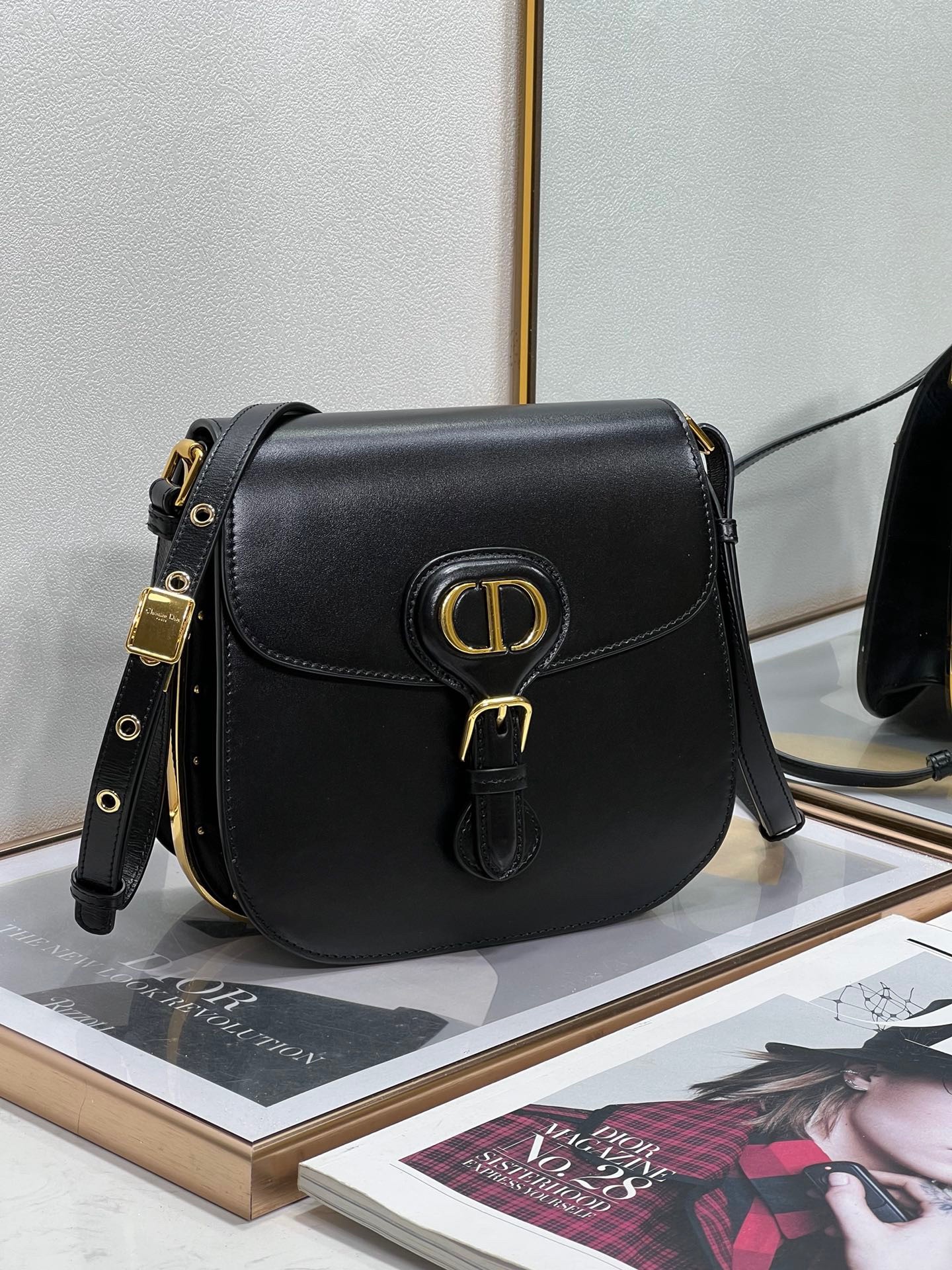 Inspired by a Marc Bohan creation from the House archives, Maria Grazia Chiuri’s Dior Bobby Frame bag is an elegant style with retro charm. Crafted in box calfskin, the design is distinguished by a gusseted silhouette, flap closure and antique gold-finish metal details. Adorned with a removable, adjustable sliding shoulder strap with a military-inspired buckle, the Dior Bobby Frame bag can be carried by hand, worn over the shoulder or crossbody.