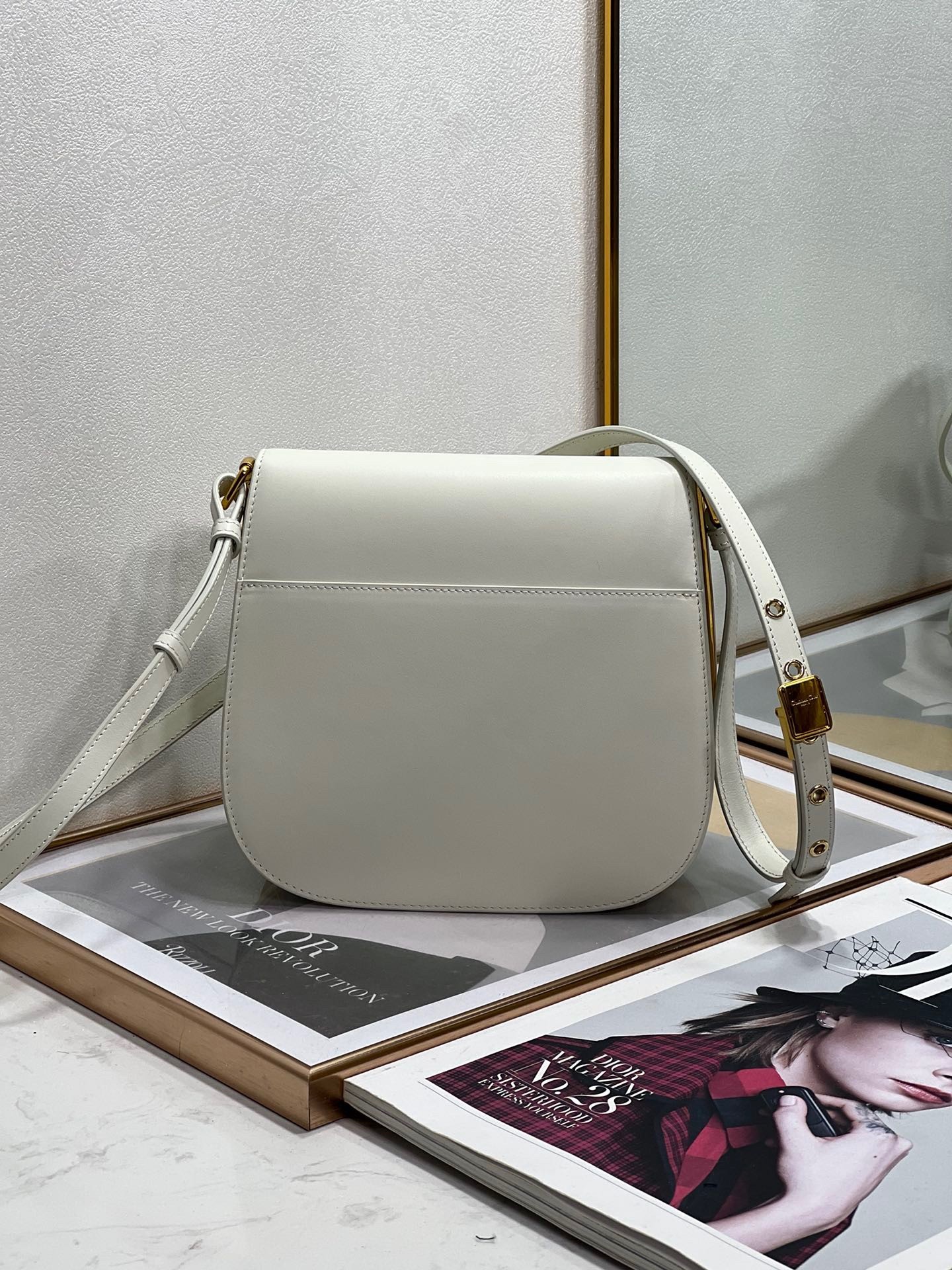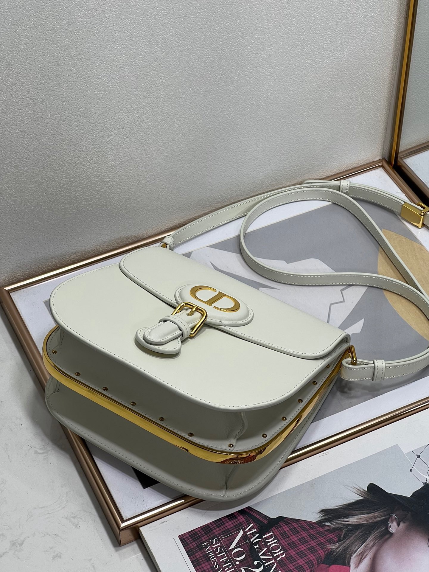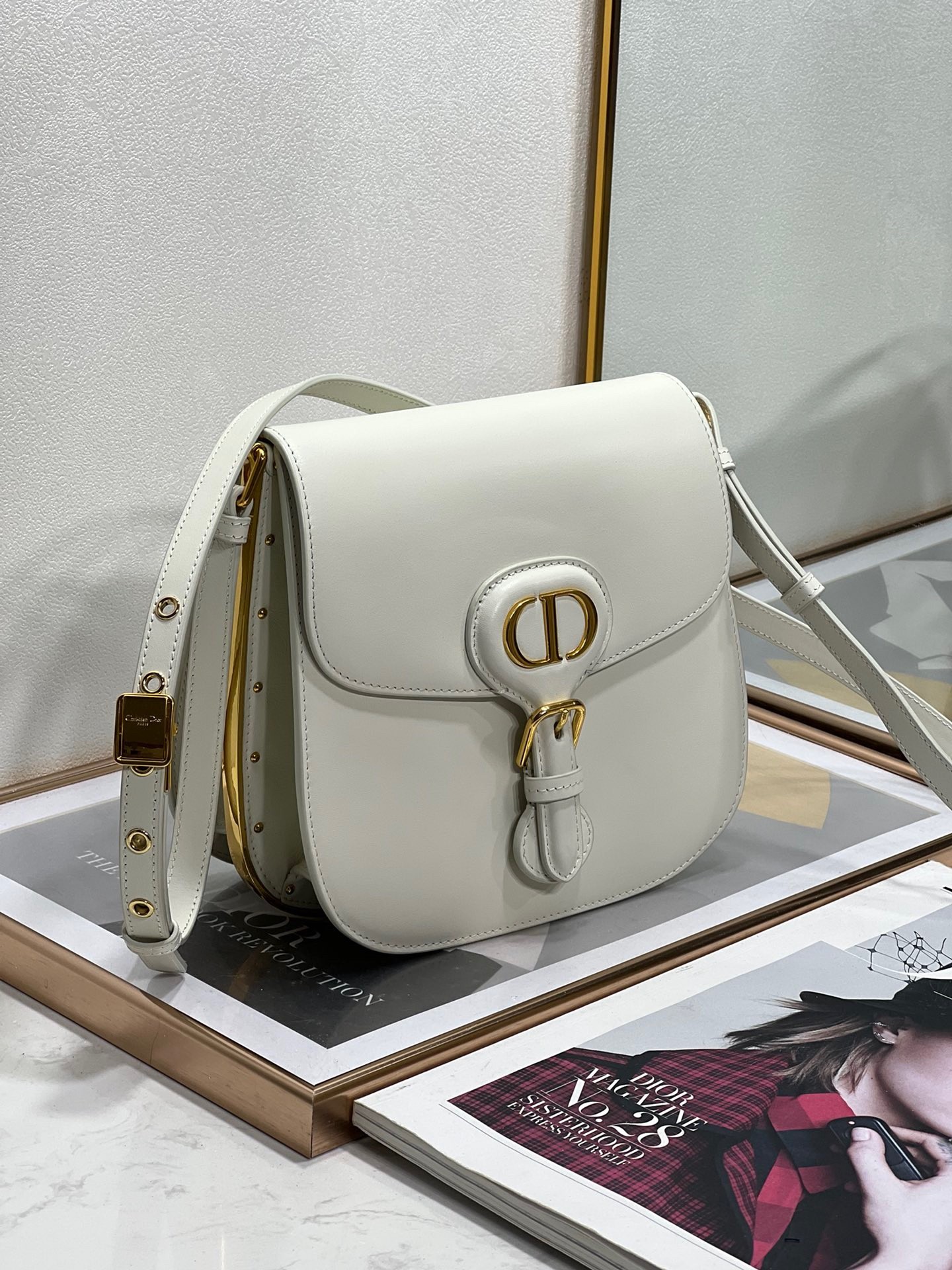 Inspired by a Marc Bohan creation from the House archives, Maria Grazia Chiuri’s Dior Bobby Frame bag is an elegant style with retro charm. Crafted in box calfskin, the design is distinguished by a gusseted silhouette, flap closure and antique gold-finish metal details. Adorned with a removable, adjustable sliding shoulder strap with a military-inspired buckle, the Dior Bobby Frame bag can be carried by hand, worn over the shoulder or crossbody.