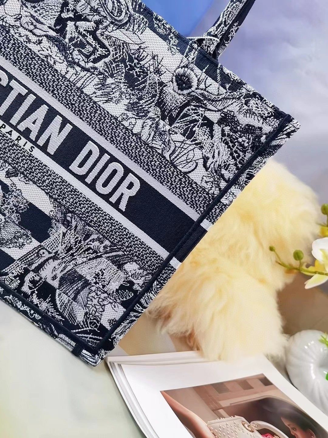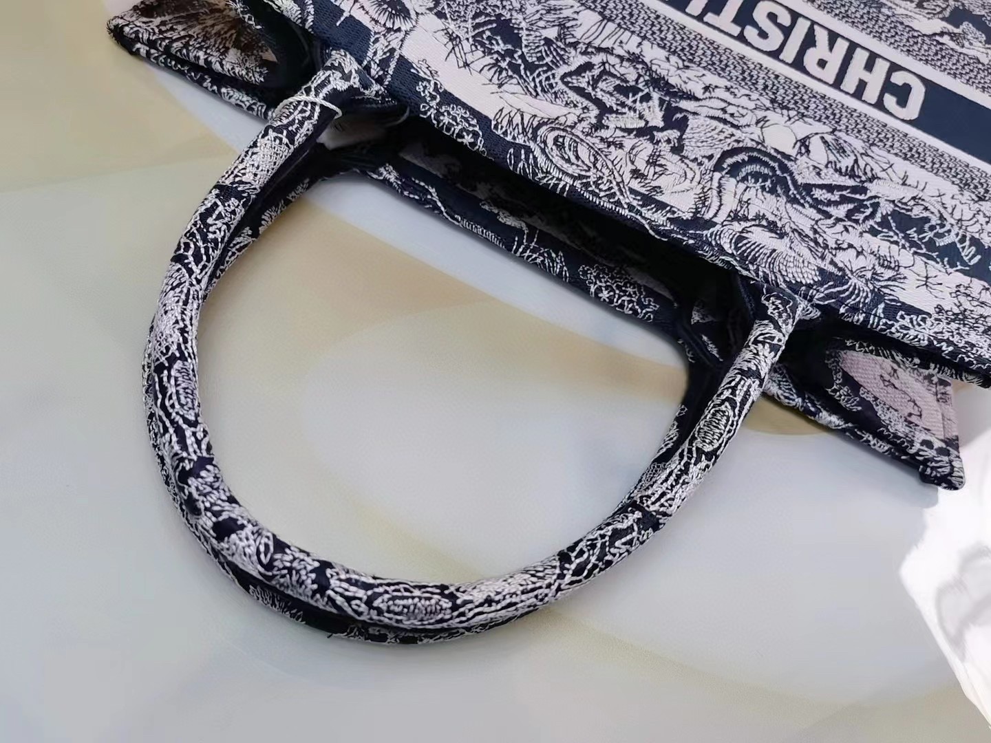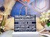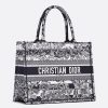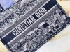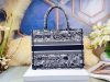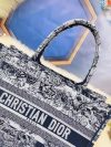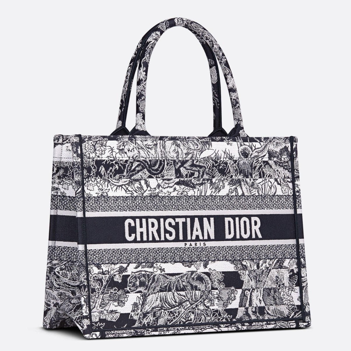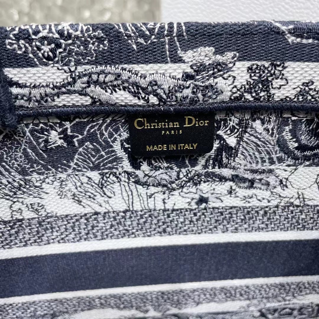 Introduced by Maria Grazia Chiuri, Creative Director of Christian Dior, the Dior Book Tote has become a staple of the Dior aesthetic. Designed to hold all the daily essentials, the style is fully embroidered with a navy blue Toile de Jouy Stripes motif, a variation of the House’s hallmark pattern with a play of stripes and reversed colors. Adorned with the ‘CHRISTIAN DIOR PARIS’ signature on the front, the medium tote exemplifies the House’s signature savoir-faire and may be carried by hand or worn over the shoulder.