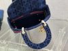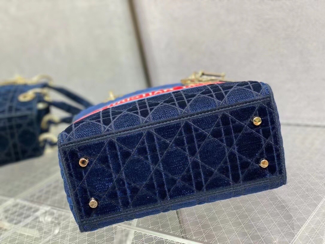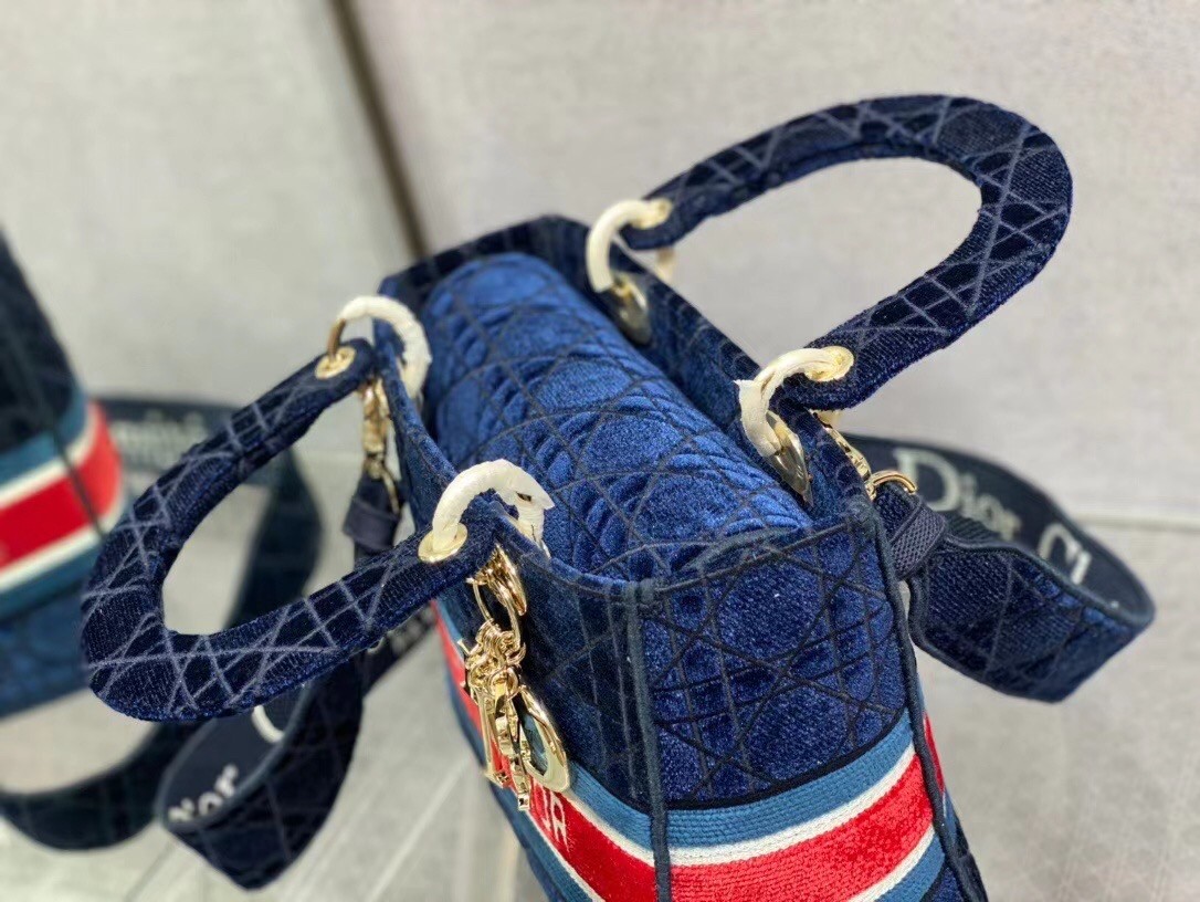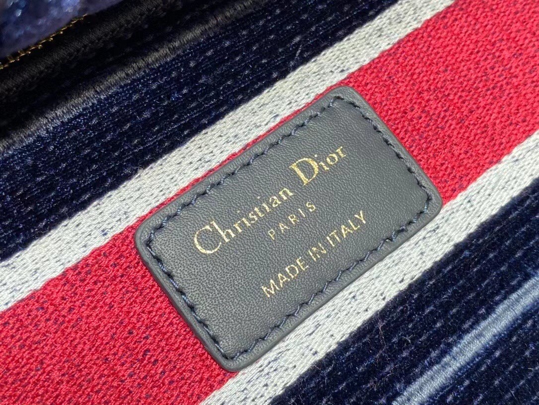 The Lady D-Lite bag combines classic elegance with House modernity. The style is fully embroidered with a Cannage motif in matte cotton thread, accentuating the velvet’s silky effect. The front features a three-tone ‘CHRISTIAN DIOR’ signature while the thick ‘D.I.O.R.’ charms in pale gold-finish metal further enhance the silhouette. Equipped with a wide, reversible and removable embroidered shoulder strap, the medium Lady D-Lite bag can be carried by hand, worn over the shoulder or crossbody.