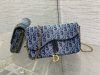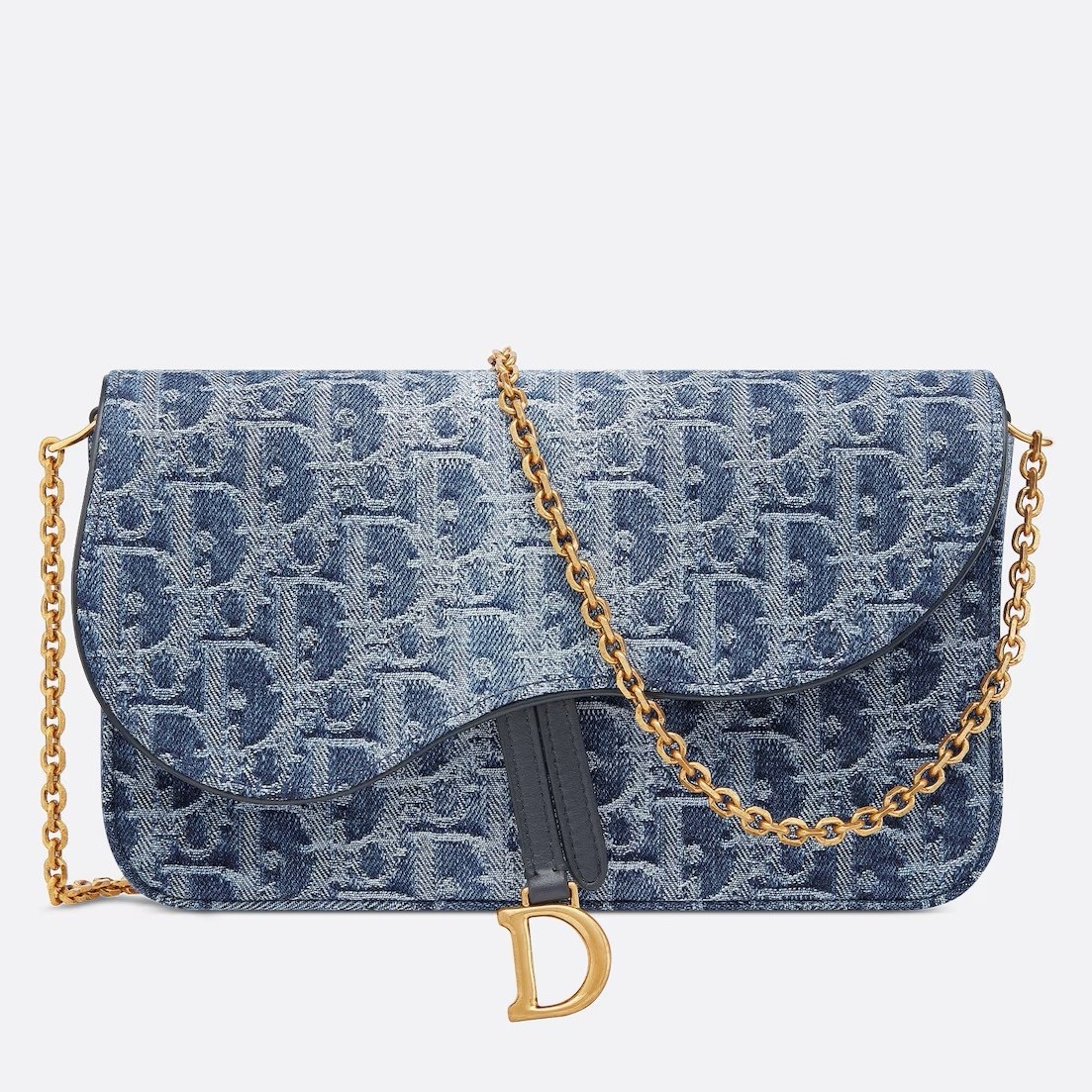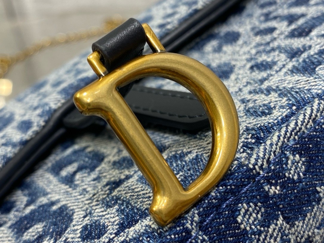 A bolsa Saddle com corrente é uma criação moderna e prática com linhas suaves e harmoniosas. Confeccionada em jacquard azul Denim Dior Oblique, ela oferece uma nova abordagem do motivo icônico da Maison, com o apelo moderno de um efeito irregular de lavagem com pedras, e apresenta uma aba assimétrica e um estribo em D de metal com acabamento em ouro antigo. O interior espaçoso acomoda todos os objectos essenciais, enquanto a corrente permite que seja usada ao ombro ou a tiracolo. A bolsa combina bem com outras criações Saddle.