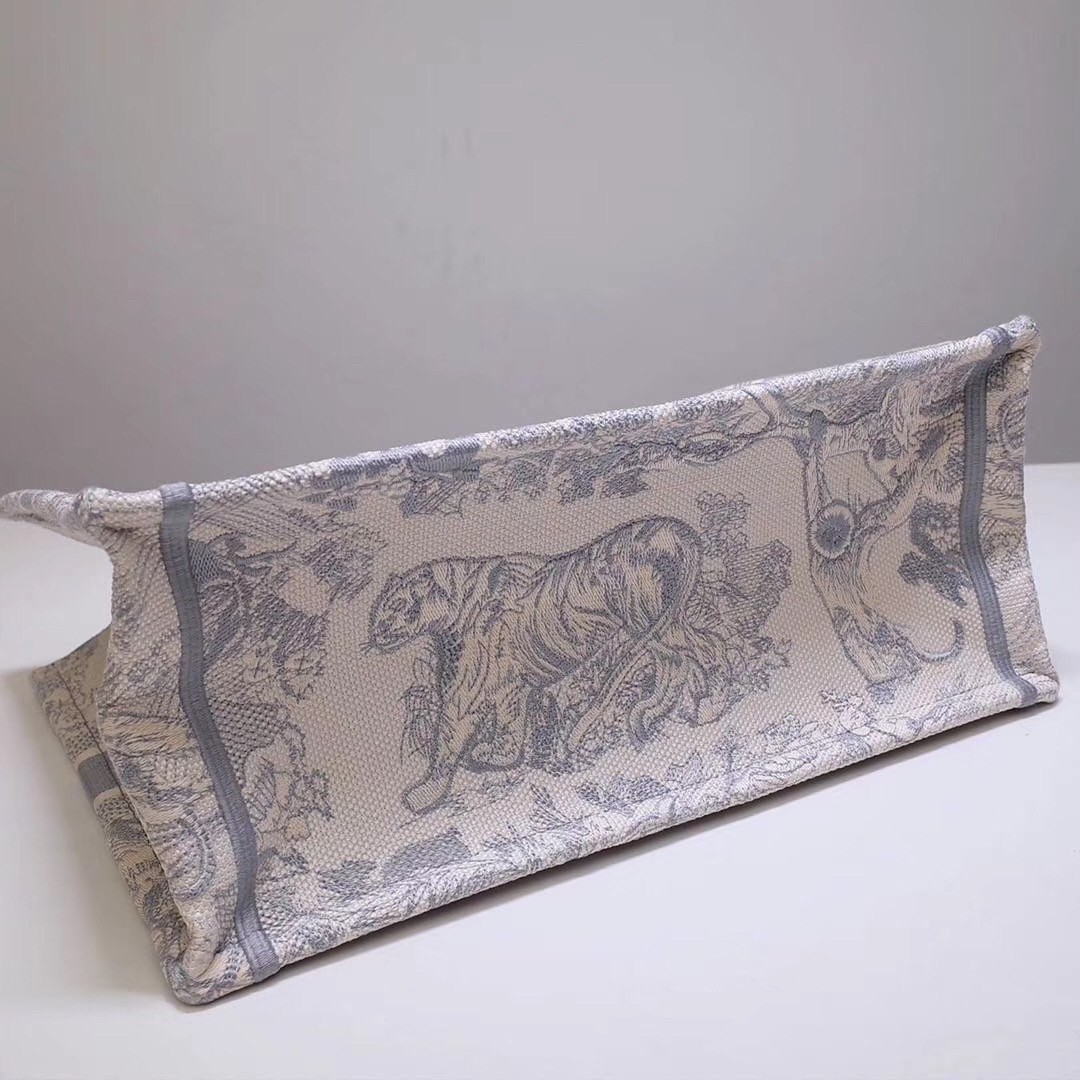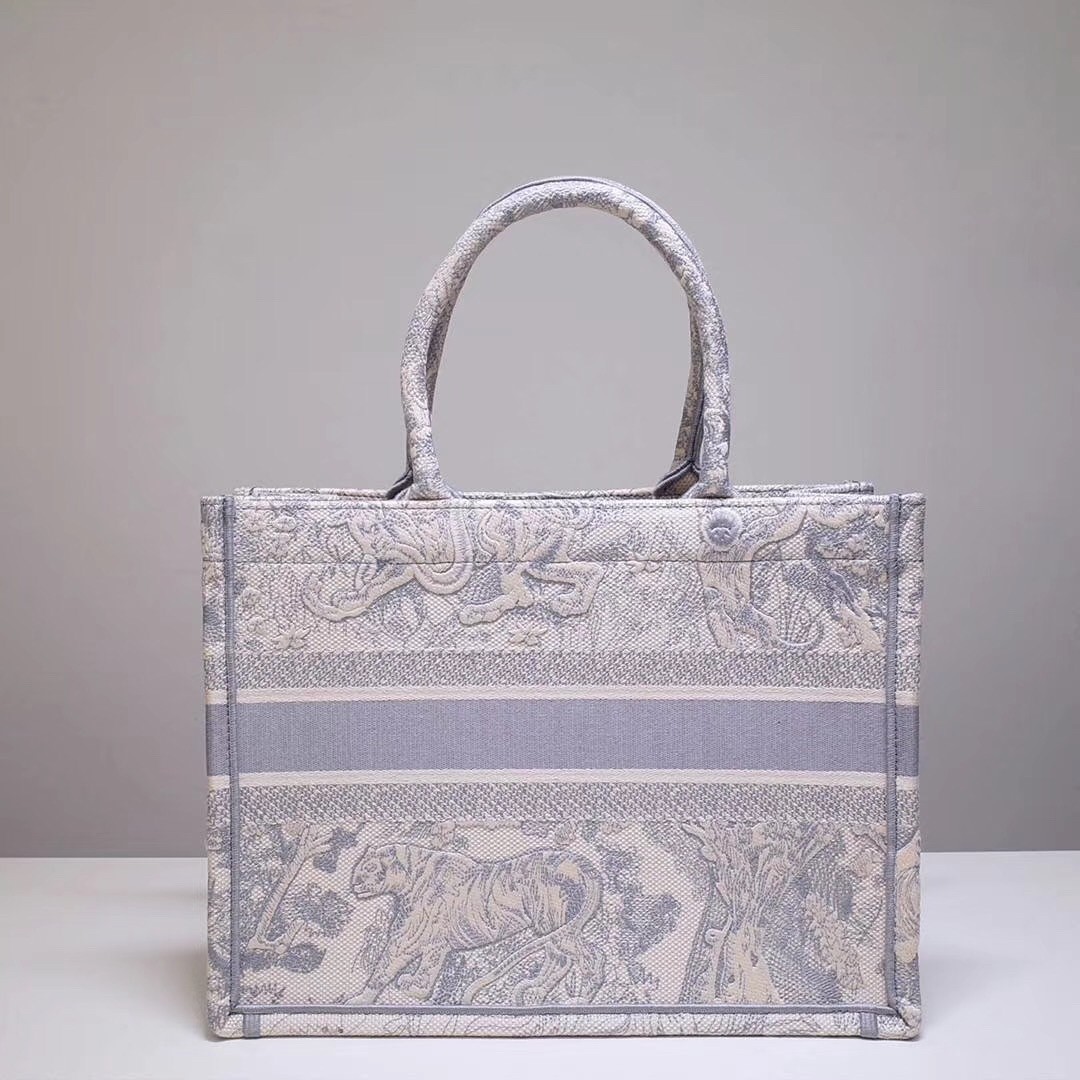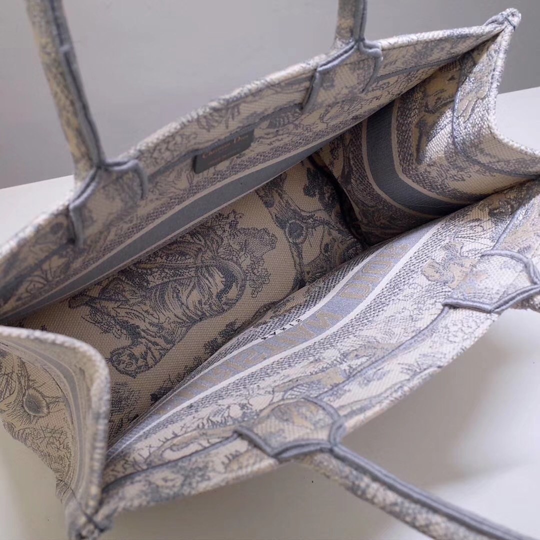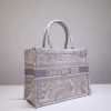The Dior Book Tote, an original style introduced by Creative Director Maria Grazia Chiuri, has become a staple of the Dior aesthetic. Ideally designed to carry all your daily essentials, the small shape is fully embroidered with a gray Toile de Jouy motif and the ‘Christian Dior’ signature on the front. This carryall, part of the Dioriviera capsule, is a perfect example of the Dior savoir-faire and it may be worn with other small accessories or the Mitzah scarf for a complete look.