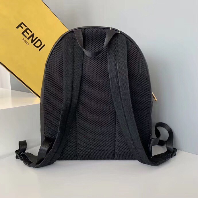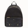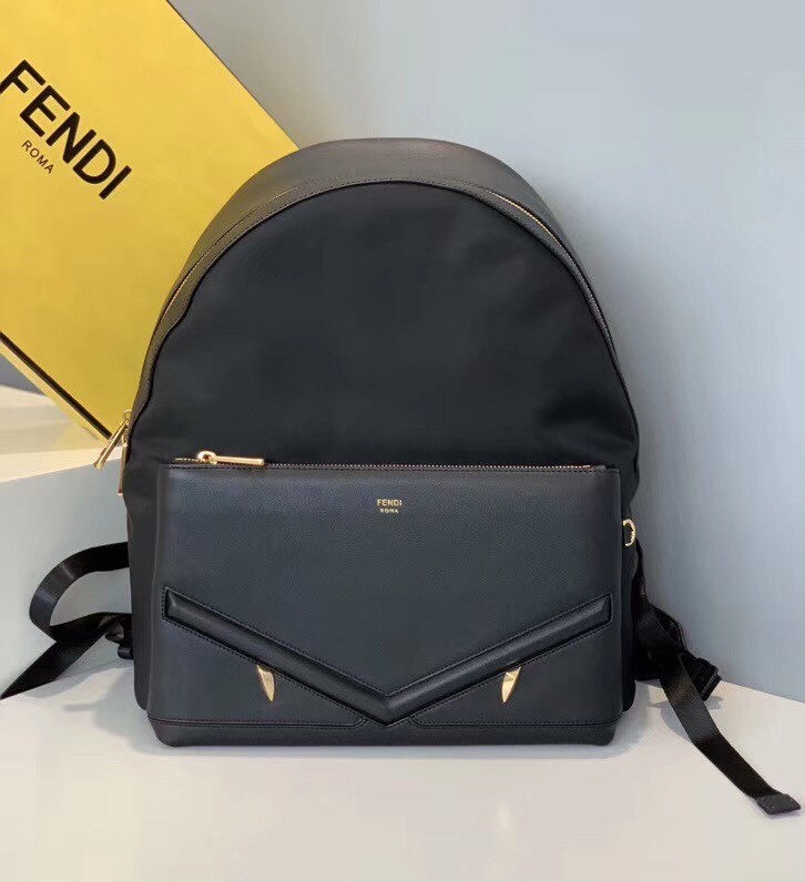 Large backpack with front pocket. Breathable technical mesh back and adjustable shoulder straps. Zip fastening with double slider and inside pocket. Made of black nylon. The leather pocket is decorated with embossed appliqu??s and metal studs that evoke the Bag Bugs eyes. Gold-finish metalware.