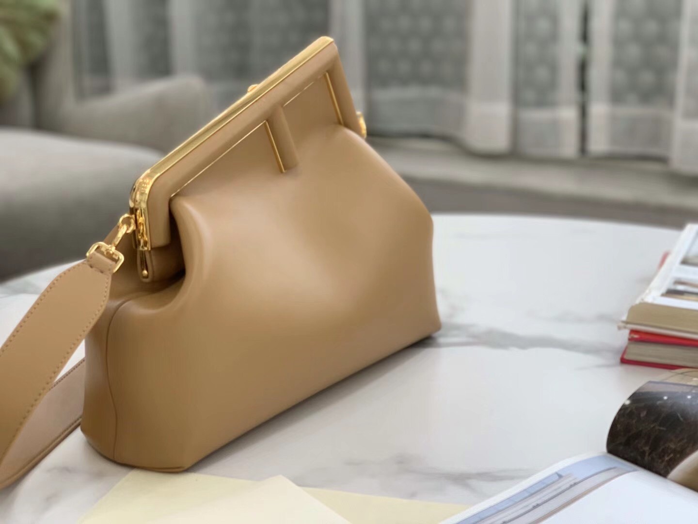Kim Jones introduces the First bag, a soft clutch silhouette with the iconic ??F?? logo incorporated into its fastening. This bag made of soft nappa leather with oversized metal F clasp bound with tone on tone nappa leather. You can style the First by hand as a clutch or worn on the shoulder thanks to the detachable shoulder strap.