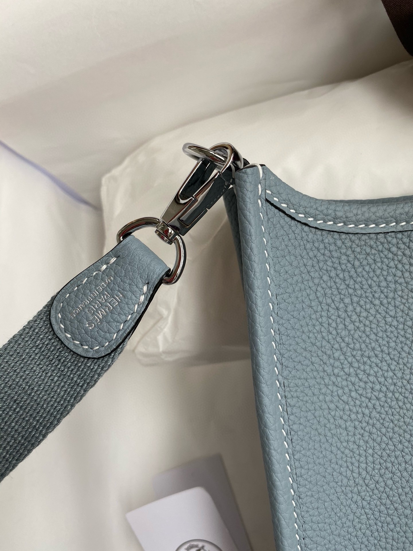 Seja o primeiro a avaliar "Hermes Evelyne Mini Handmade Bag in Blue Lin Clemence Leather"