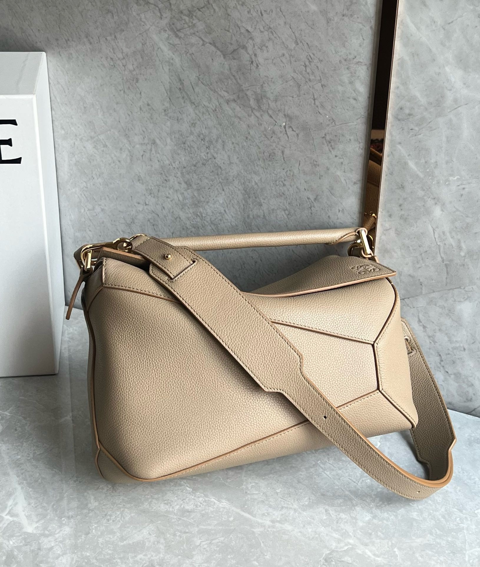 The first bag designed after Jonathan Anderson was appointed creative director in 2014, the Puzzle bag from LOEWE exudes modern artistry with its innovative cuboid shape 每 one that takes 524 actions to complete and perfect. This medium version has been made from grained calfskin with a canvas-lined interior and outer zipped pocket to keep daily essentials secure.