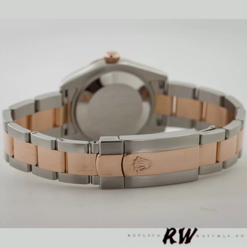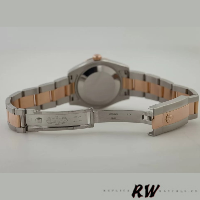 Rolex Datejust 178341 Black MOP Diamond Dial 31MM Lady Replica Watch,31mm Everose Rolesor case comprised of Oystersteel and Everose gold, screw-down back, screw-down crown with twinlock double waterproofness system, Everose gold domed bezel set with 24 diamonds, scratch-resistant sapphire crystal with cyclops lens over the date, Mother of Pearl Black Dial Set with 10 Diamond Hour Markers, Date calendar at 3 o’clock aperture.Comes on 2-tone with a stainless steel and rose gold bracelet finished with a folding clasp.
