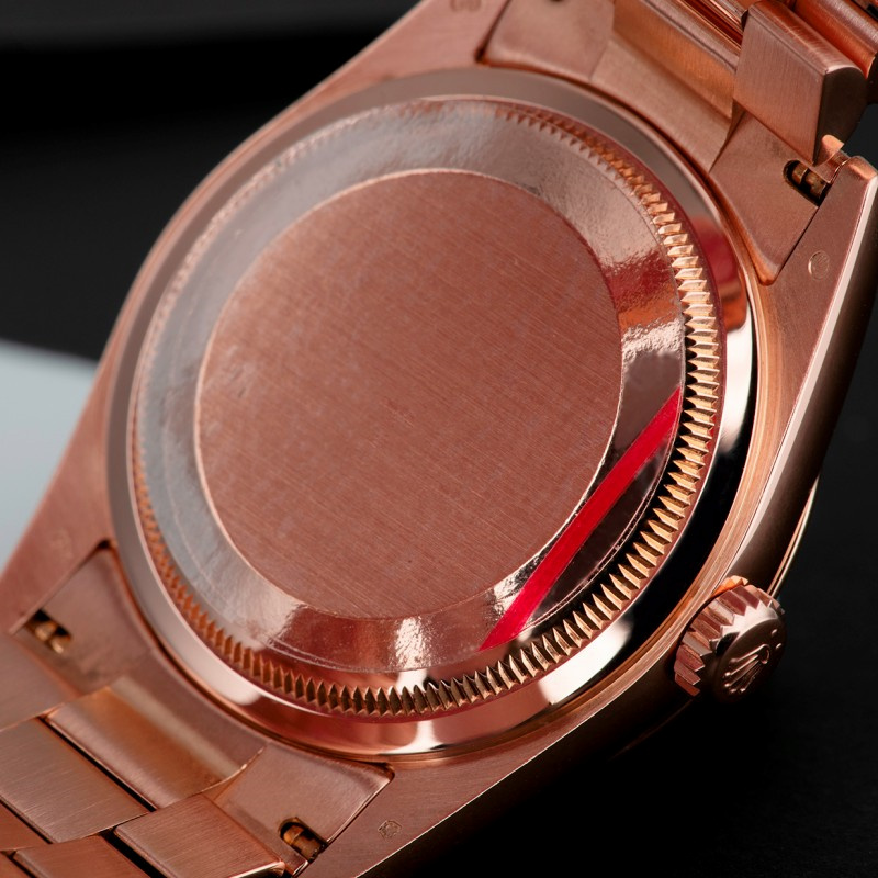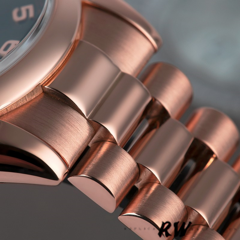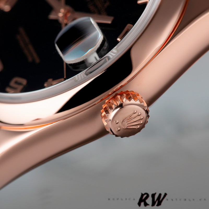 Rolex Day-Date 118205 Black Arabic Dial 36mm Unisex Replica Watch. 36 mm Round case shape.Fixed – domed everose gold bezel. Black dial with rose-gold tone hands and Arab numeral hour markers. Minute markers around the outer rim. Dial Type: Analog. Date display at 3 o’clock; day display at 12 o’clock. Scratch resistant sapphire crystal. Screw down crown.Brushed with Polished Solid Everose Gold Oyster Bracelet.