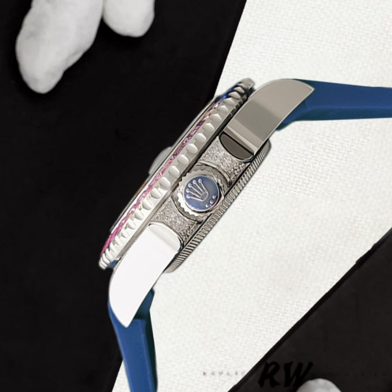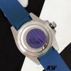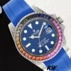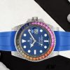 Rolex Submariner 116610 Blue Dial Blue Rubber strap 40mm Mens Replica Watch has a Stainless Steel 40 mm Round Case ,The black dial with dot and index hour markers .Minute markers around the outer rim.Rainbow diamond bezel,Round diamonds are fitted on the lugs for an extra touch of luxury. Numerals Date window with magnifying bubble at 3 o’clock, Sapphire Crystal,Blue Leather strap made from flexible metal blades overmoulded with high-performance elastomer, Folding safety buckle with rapid extension system.