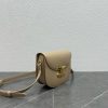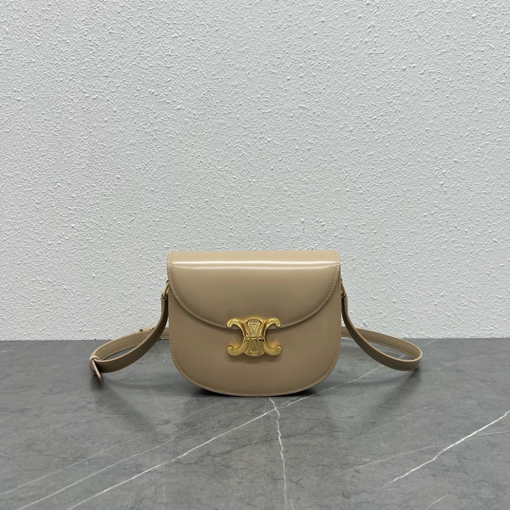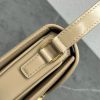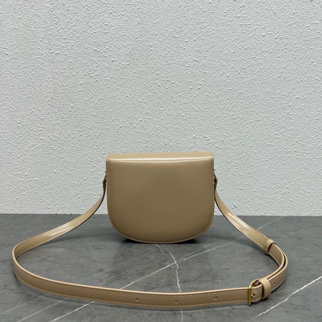 This chic shoulder bag is crafted of fine shiny calfskin leather. The bag features an adjustable leather strap with polished gold hardware and a matching gold press lock on the crossover flap. The flap opens to a front pocket and leather interior with a zipper pocket.