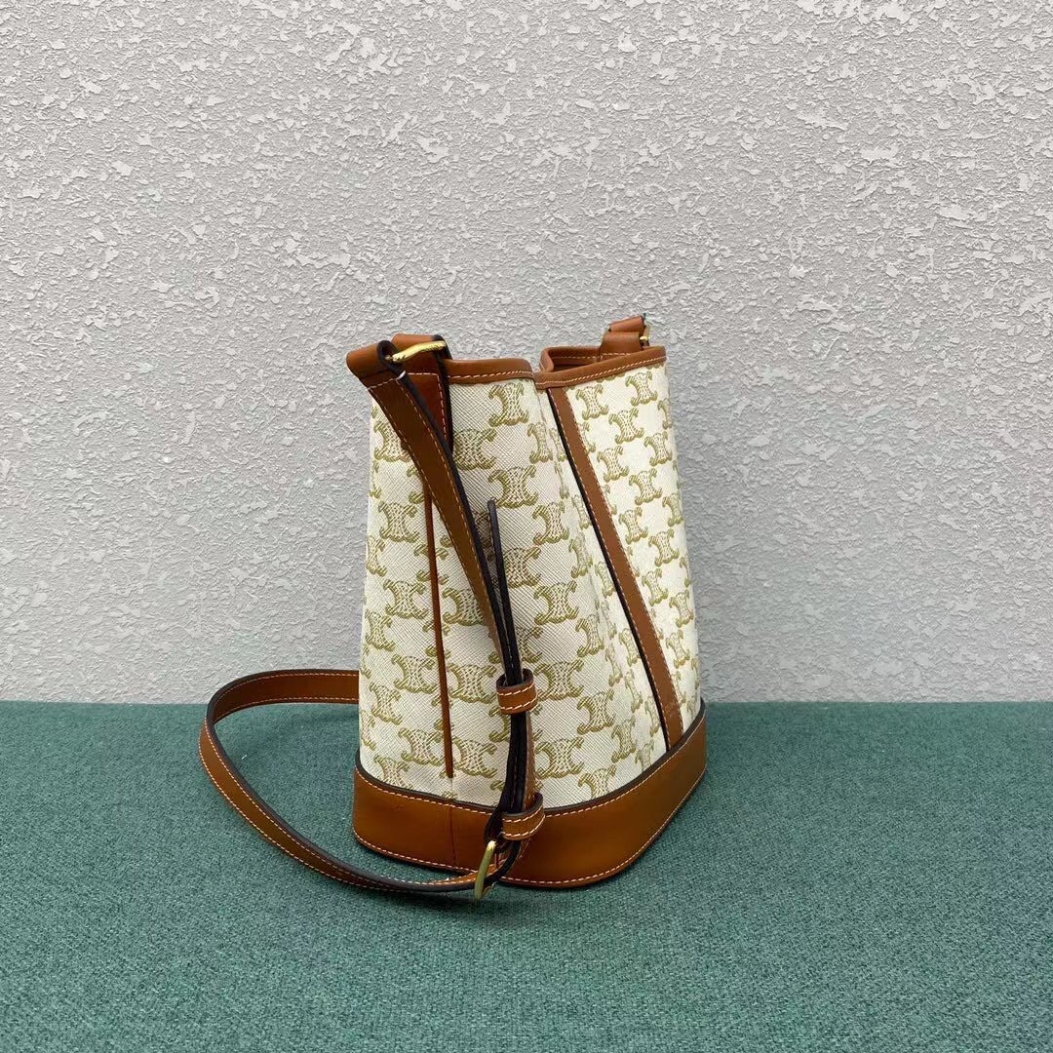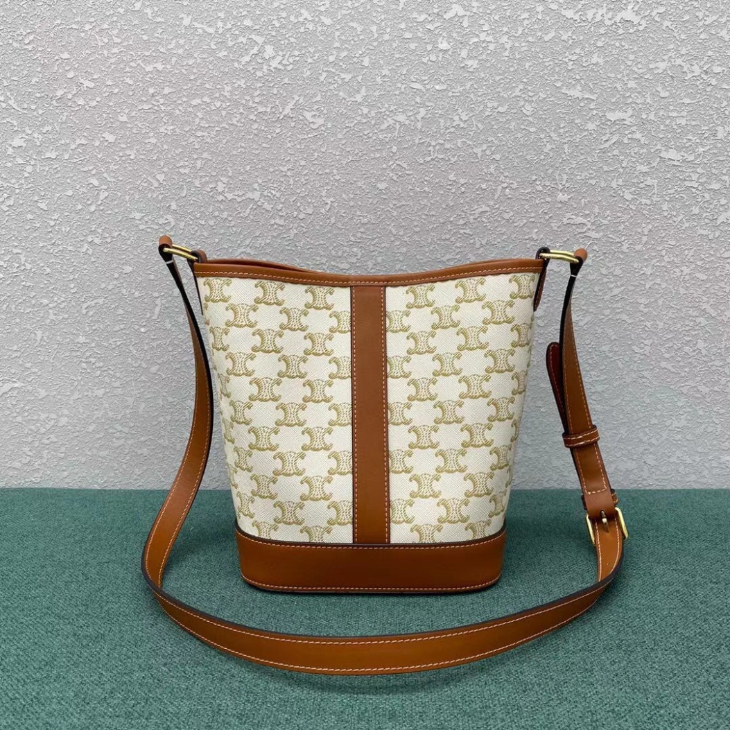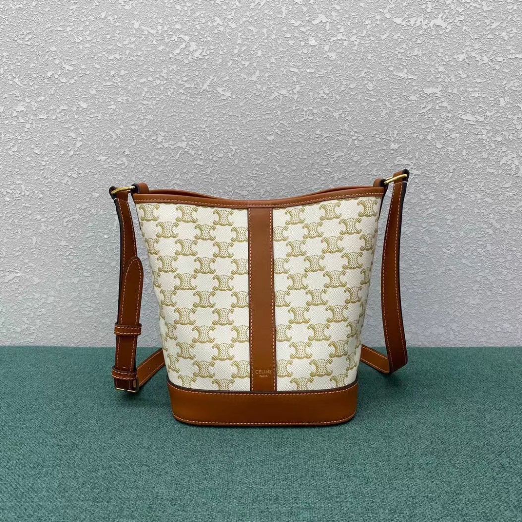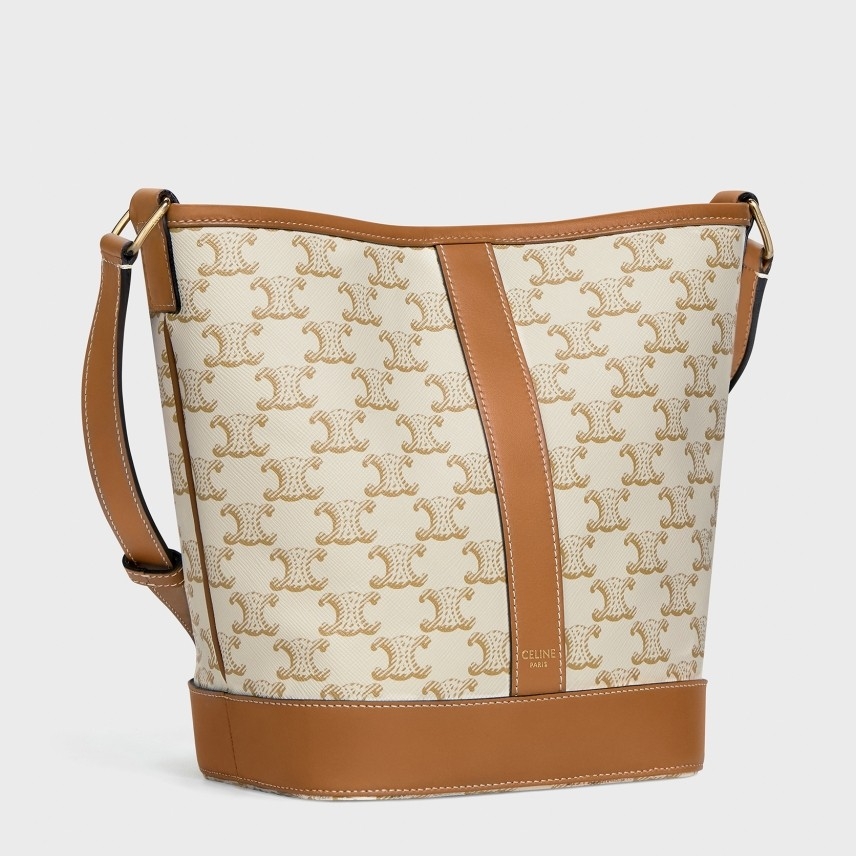 Trimmed in calfskin leather, this Small Model Triomphe Canvas Bucket Bag is a piece from the Celine collection. Embellished with a textile lining, this accessory, which features delicate golden finishes such as the House’s iconic logo on the front, has a snap fastening and an adjustable leather shoulder strap for cross-body or shoulder wear.