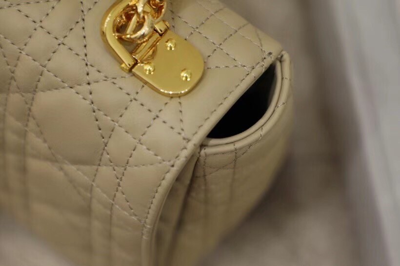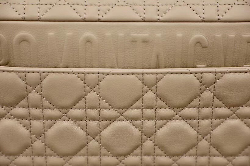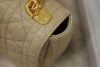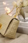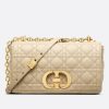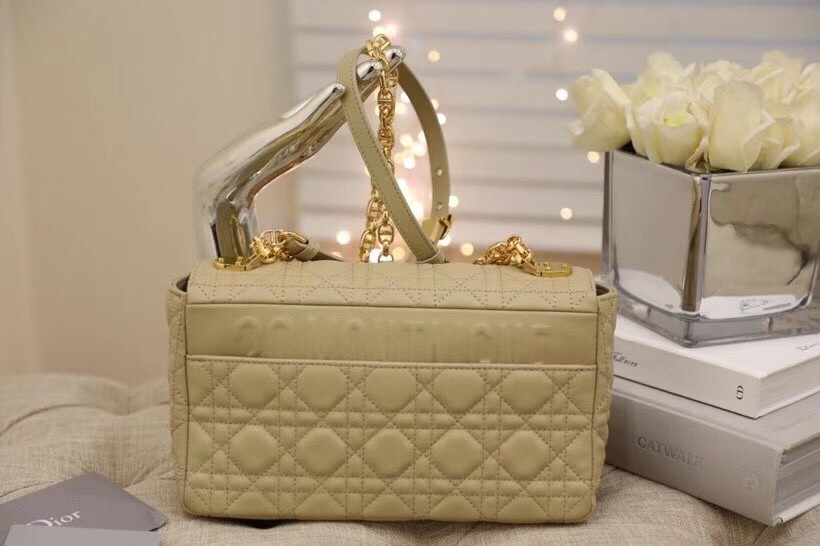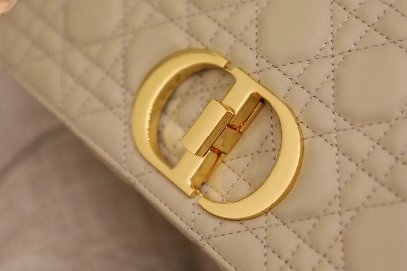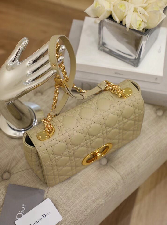 The Dior Caro bag combines modernity with timeless elegance. The design is crafted in beige calfskin with Cannage stitching. The supple bag features a flap adorned with an antique gold-finish metal ‘CD’ twist clasp, inspired by the seal of a Christian Dior perfume bottle. The detachable chain shoulder strap with ‘CD’ signature links allows the medium bag to be carried by hand or worn over the shoulder and may be replaced by one of the House’s wide embroidered straps for day or evening attire.