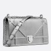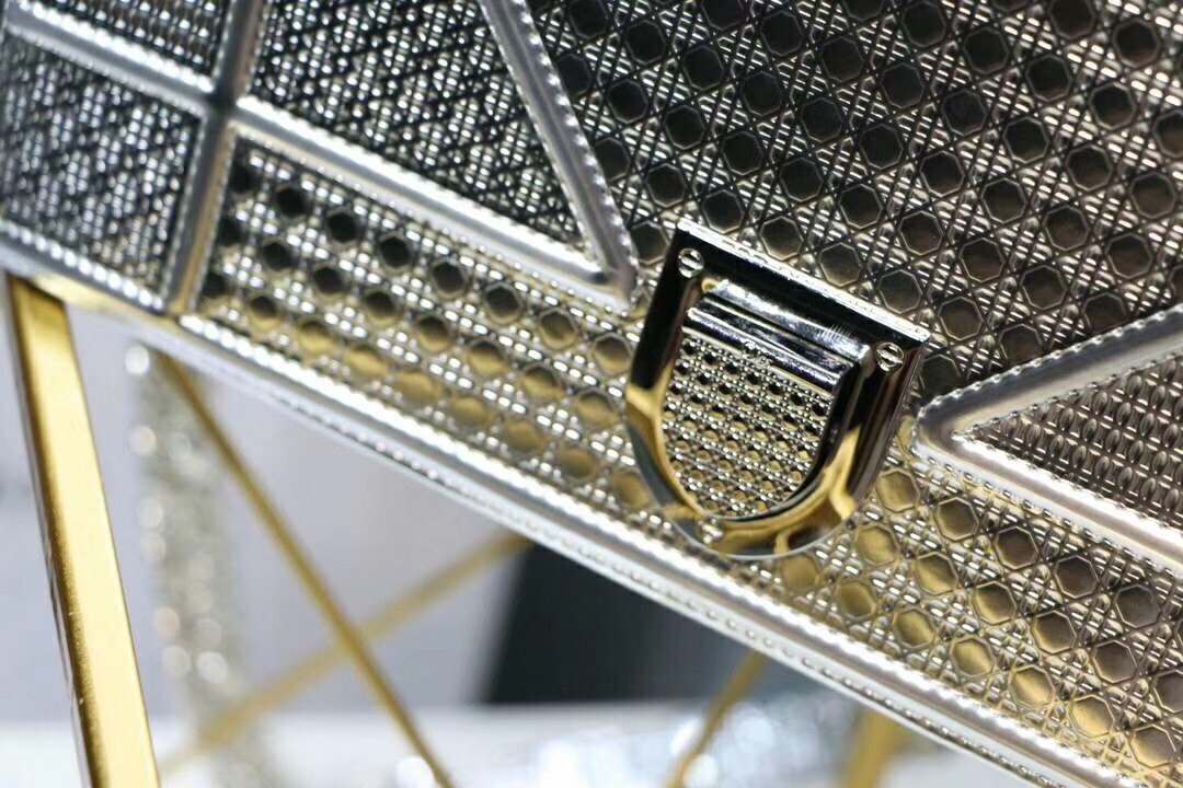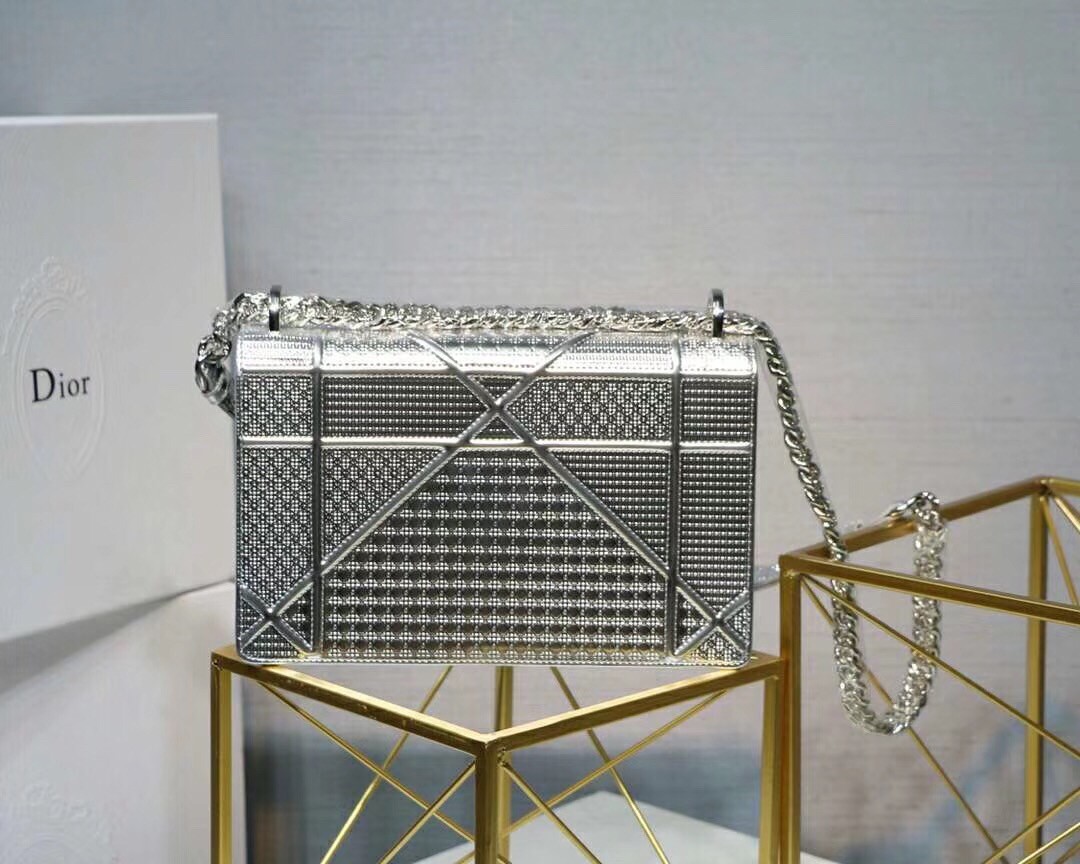 The Dior fashion house offers a futuristic version of its iconic Diorama bag. Its metallized, calfskin, micro caning motif is characterized by the contrast between the miniature and oversized caning motif. Its flap is adorned with a clasp of pale golden metal. Featuring a sliding chain, the bag can be worn over the shoulder, both with a dress and a more casual, urban outfit.
